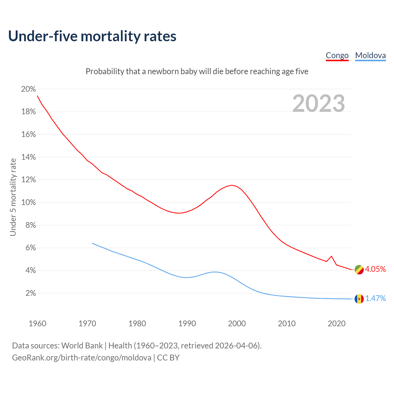 The chance that a newborn baby will die before reaching age five is 4.05% in the Congo and 1.47% in Moldova. Above is a chart with historical data on under-five mortality rates.