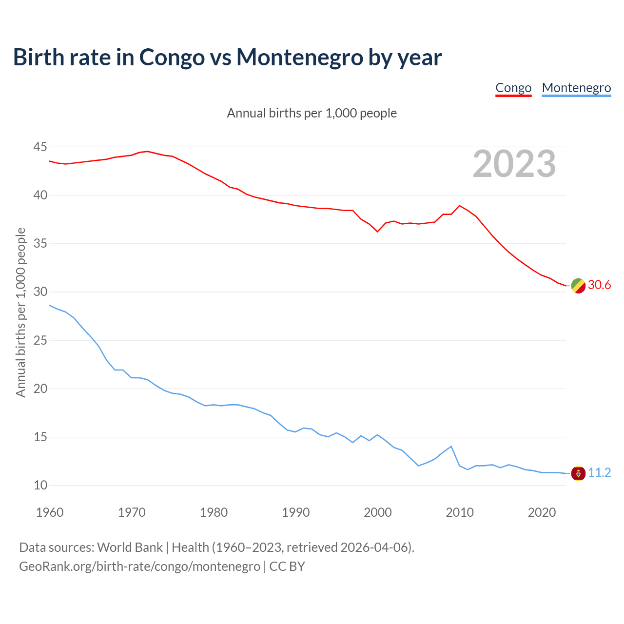 The Congo has an annual birth rate of 30.6 births per 1,000 people, compared to 11.2 for Montenegro. The average number of children a woman is expected to have during her lifetime — the fertility rate, is 4.16 in the Congo and 1.74 in Montenegro — 58.1% difference.