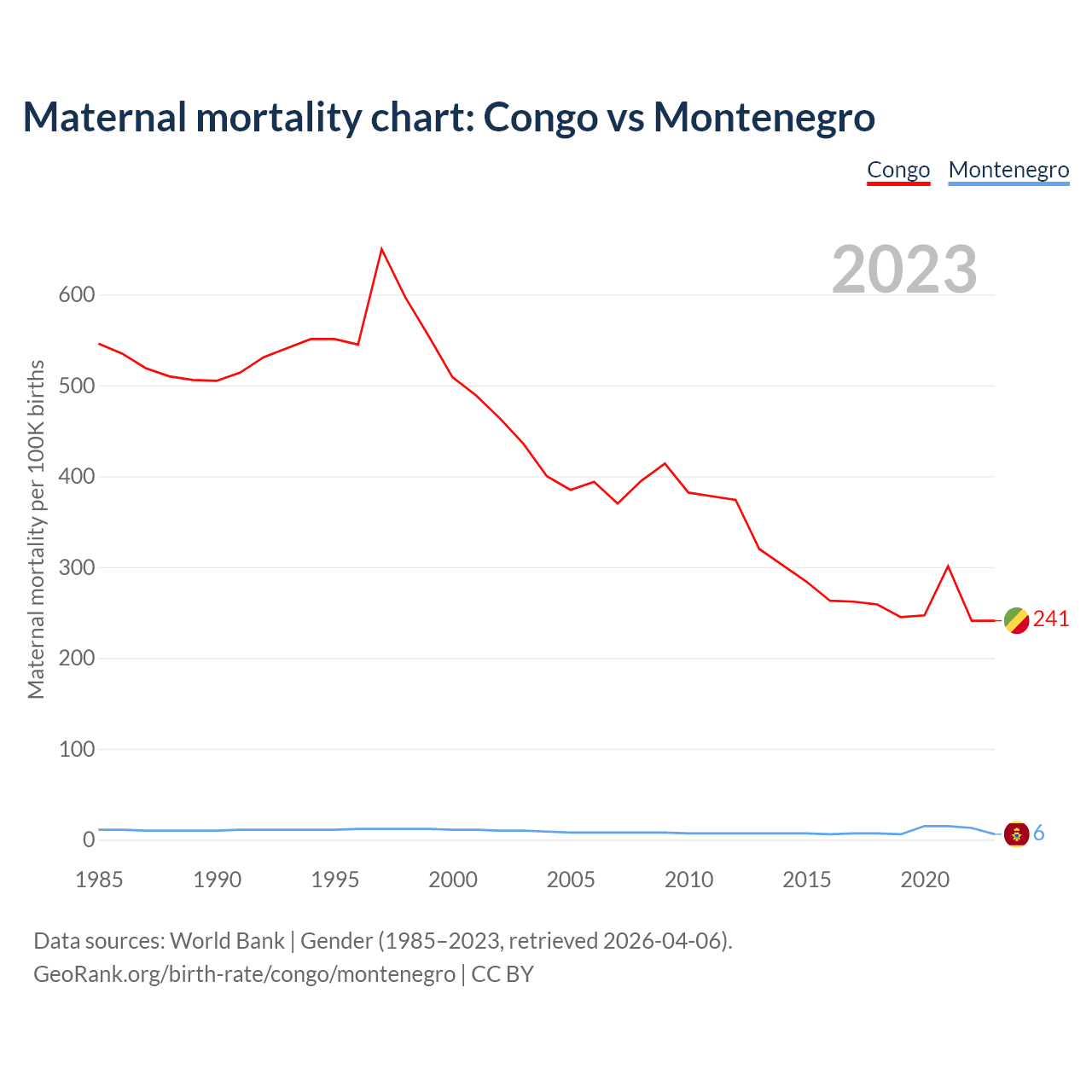 The maternal mortality rate, which is the probability of dying during childbirth or within 42 days of pregnancy termination, is 241 deaths per 100,000 live births in the Congo, compared to 6 deaths in Montenegro.