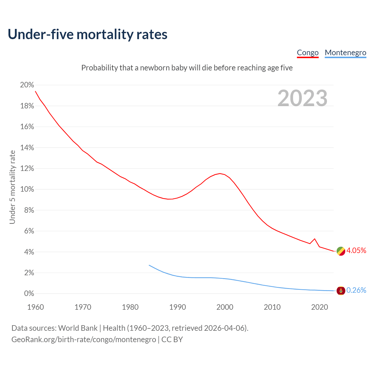 The chance that a newborn baby will die before reaching age five is 4.05% in the Congo and 0.26% in Montenegro. Above is a chart with historical data on under-five mortality rates.