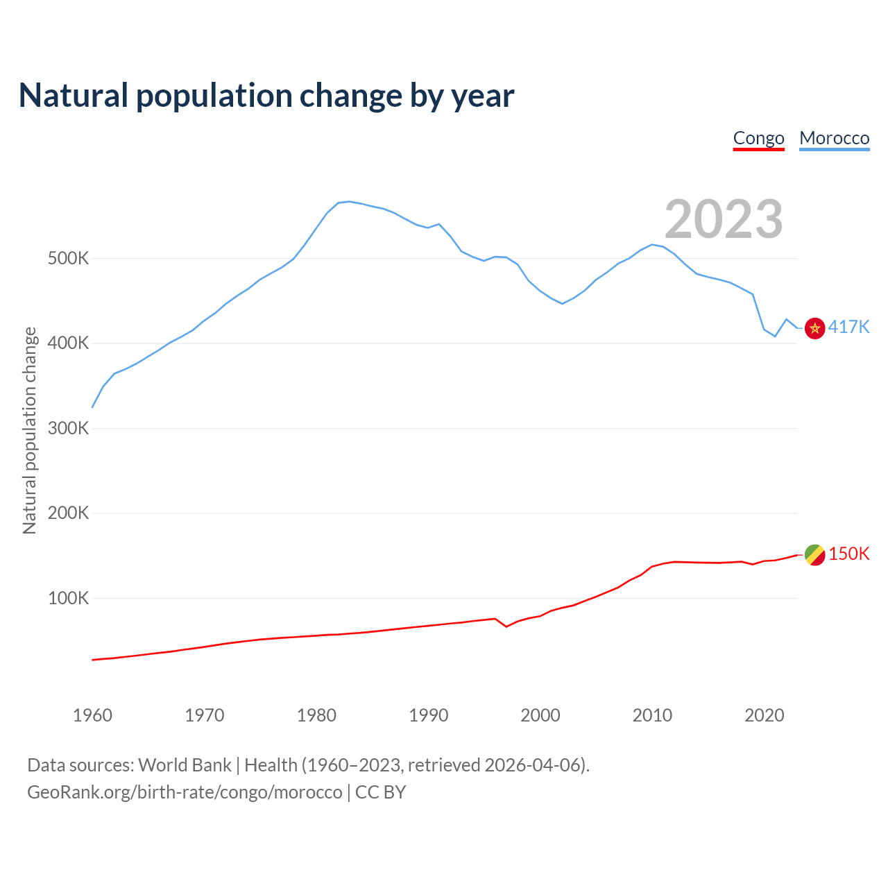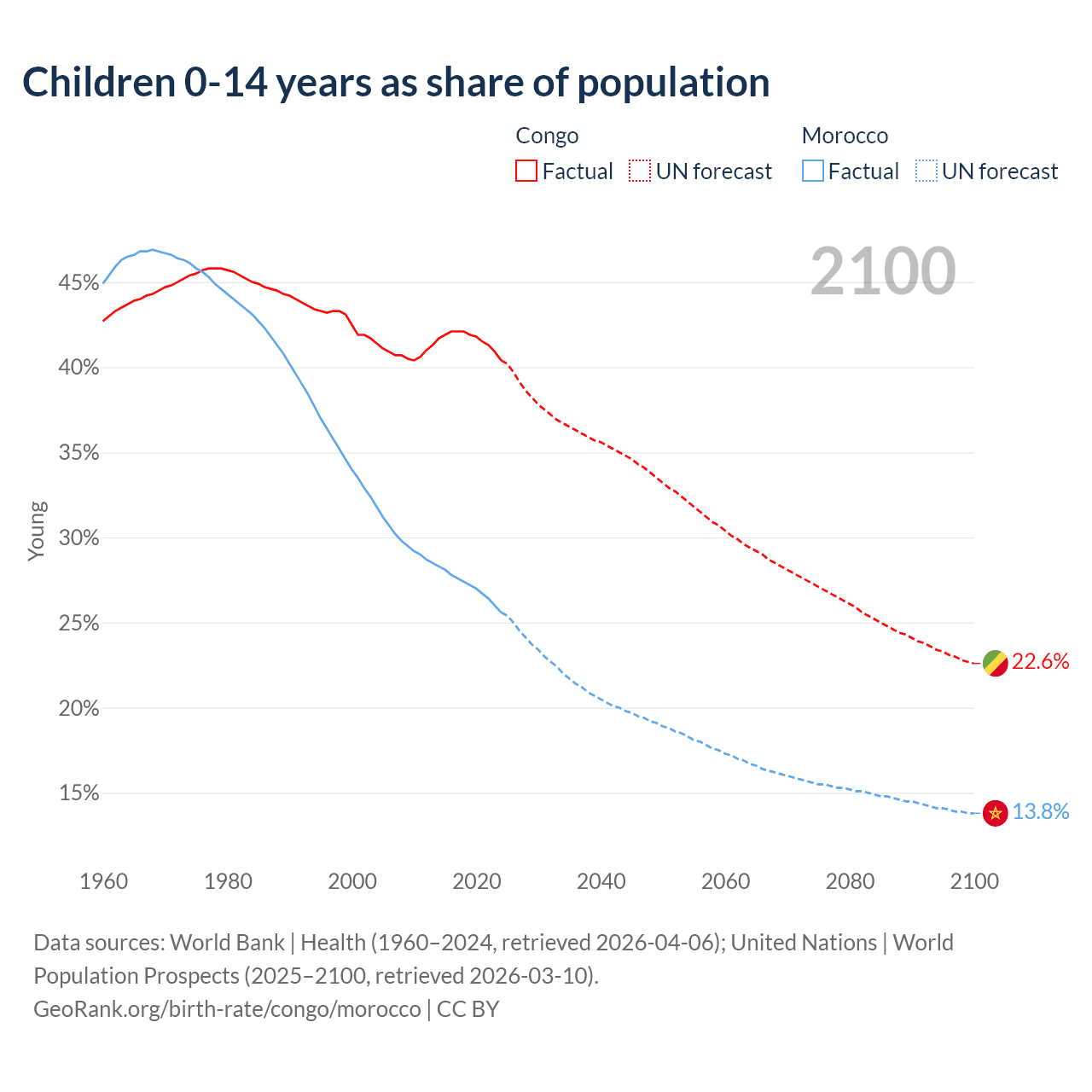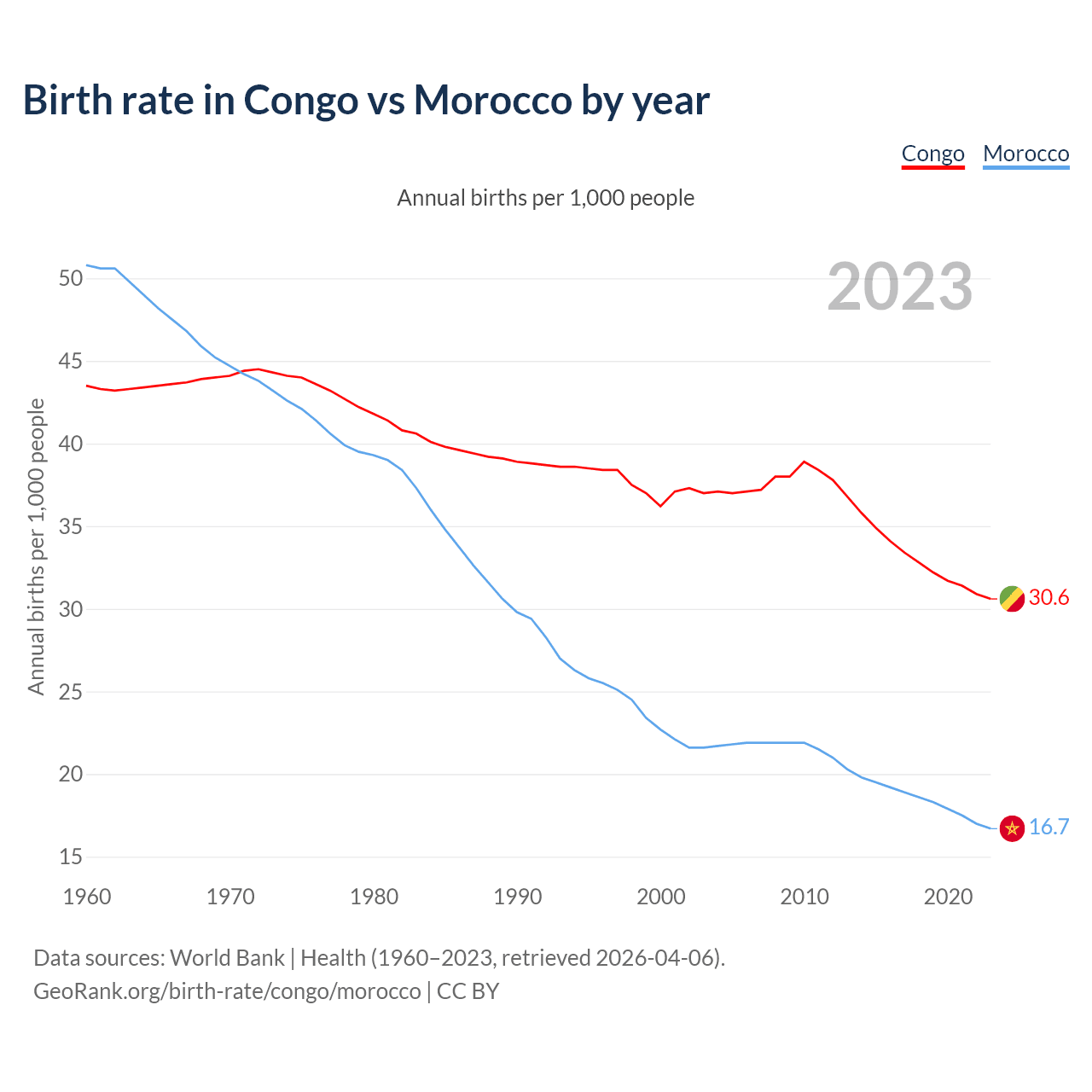 The Congo has an annual birth rate of 30.6 births per 1,000 people, compared to 16.7 for Morocco. The average number of children a woman is expected to have during her lifetime — the fertility rate, is 4.16 in the Congo and 2.23 in Morocco — 46.4% difference.