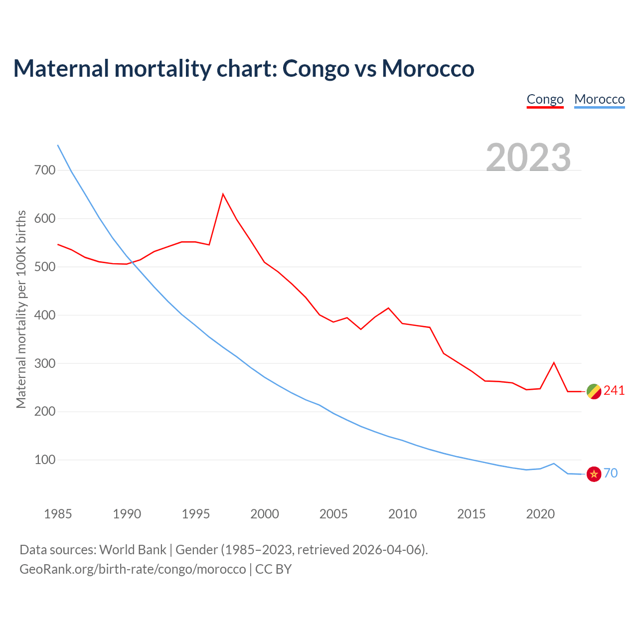 The maternal mortality rate, which is the probability of dying during childbirth or within 42 days of pregnancy termination, is 241 deaths per 100,000 live births in the Congo, compared to 70 deaths in Morocco.