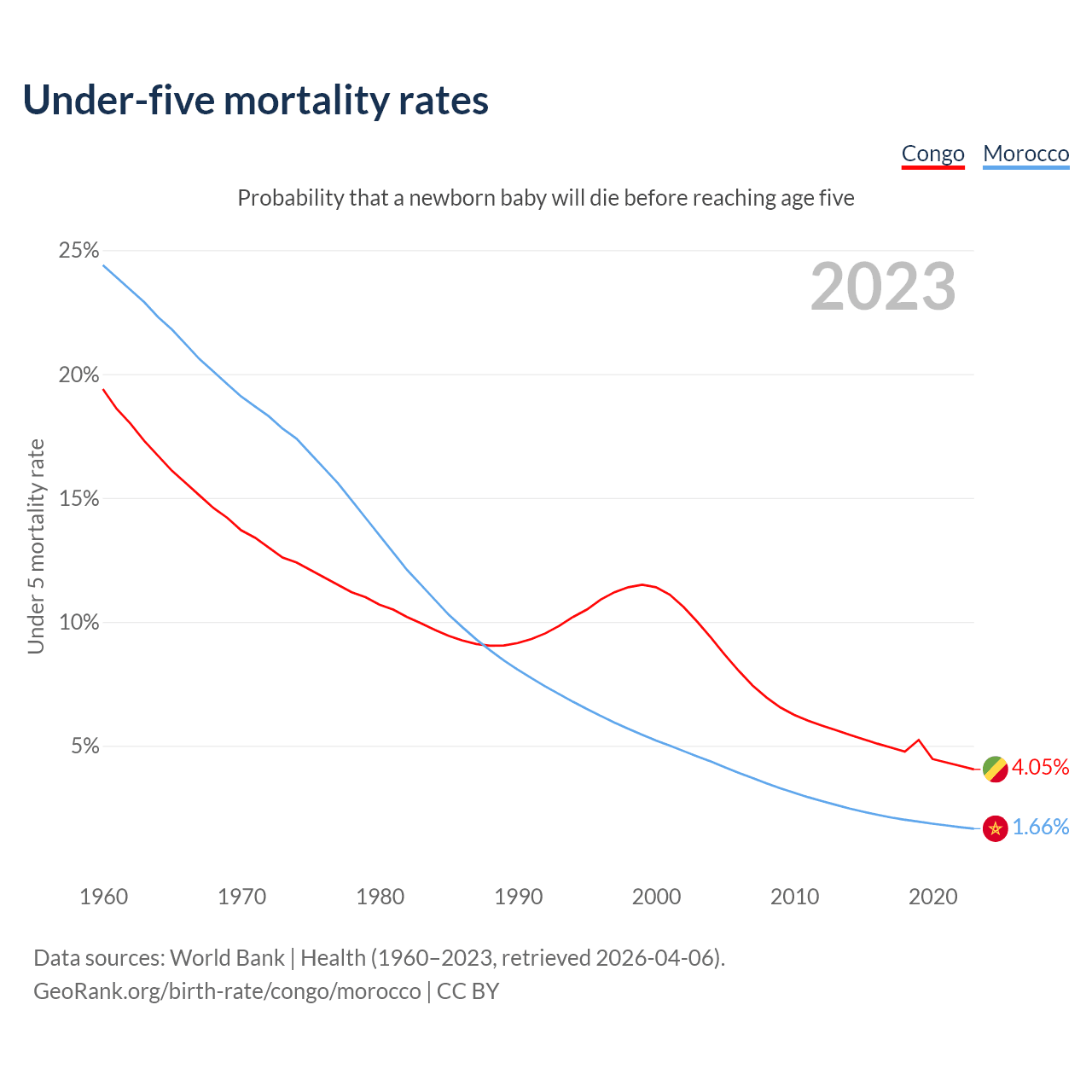 The chance that a newborn baby will die before reaching age five is 4.05% in the Congo and 1.66% in Morocco. Above is a chart with historical data on under-five mortality rates.