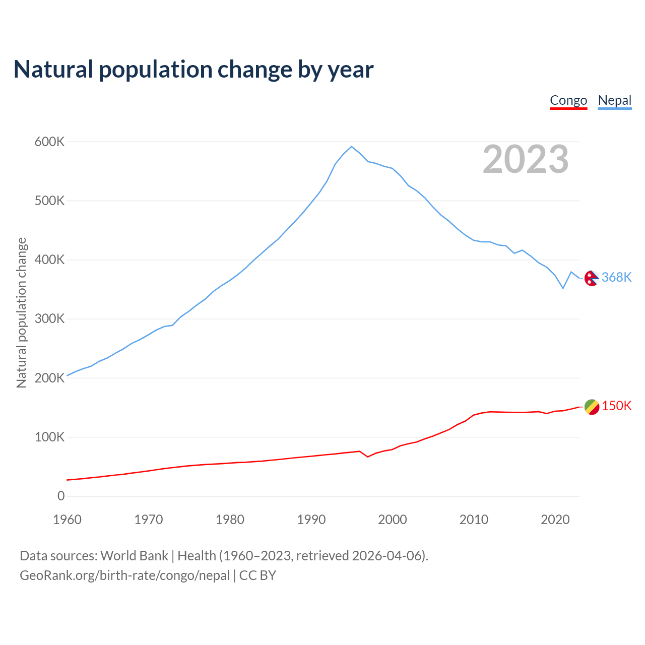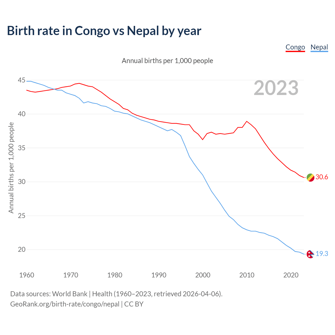 The Congo has an annual birth rate of 30.6 births per 1,000 people, compared to 19.3 for Nepal. The average number of children a woman is expected to have during her lifetime — the fertility rate, is 4.16 in the Congo and 1.98 in Nepal — 52.3% difference.