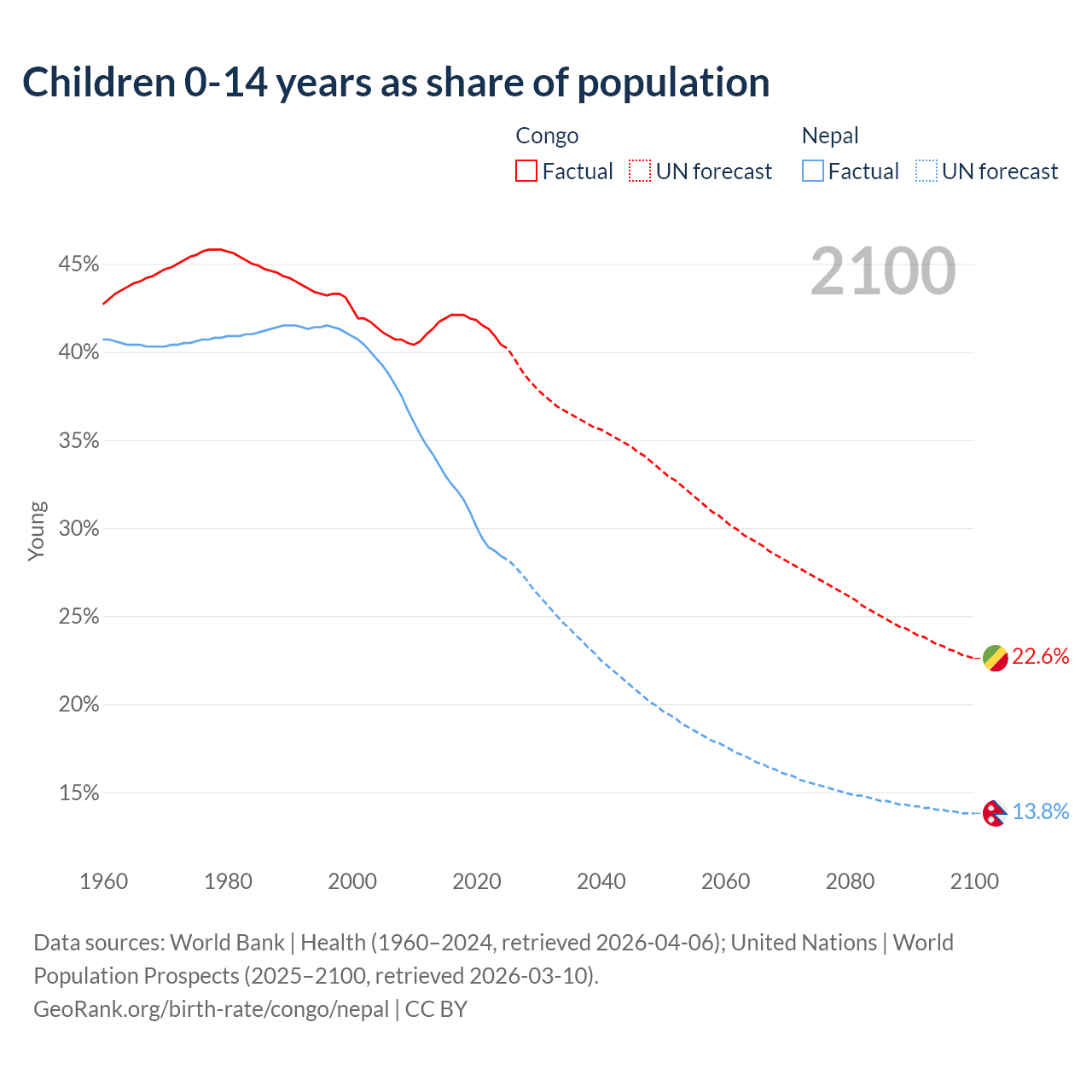 According to the latest available data on birth rates, the fertility rate in the Congo was 4.16 children per woman in 2023, compared to 1.98 in Nepal in 2023. The replacement level is considered to be 2.1 children per woman.