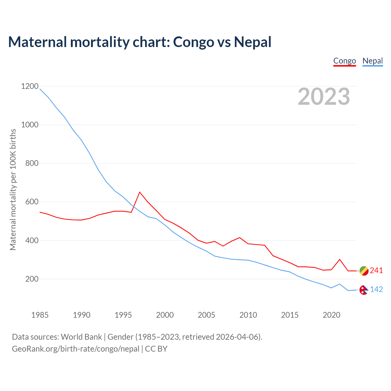 The maternal mortality rate, which is the probability of dying during childbirth or within 42 days of pregnancy termination, is 241 deaths per 100,000 live births in the Congo, compared to 142 deaths in Nepal.