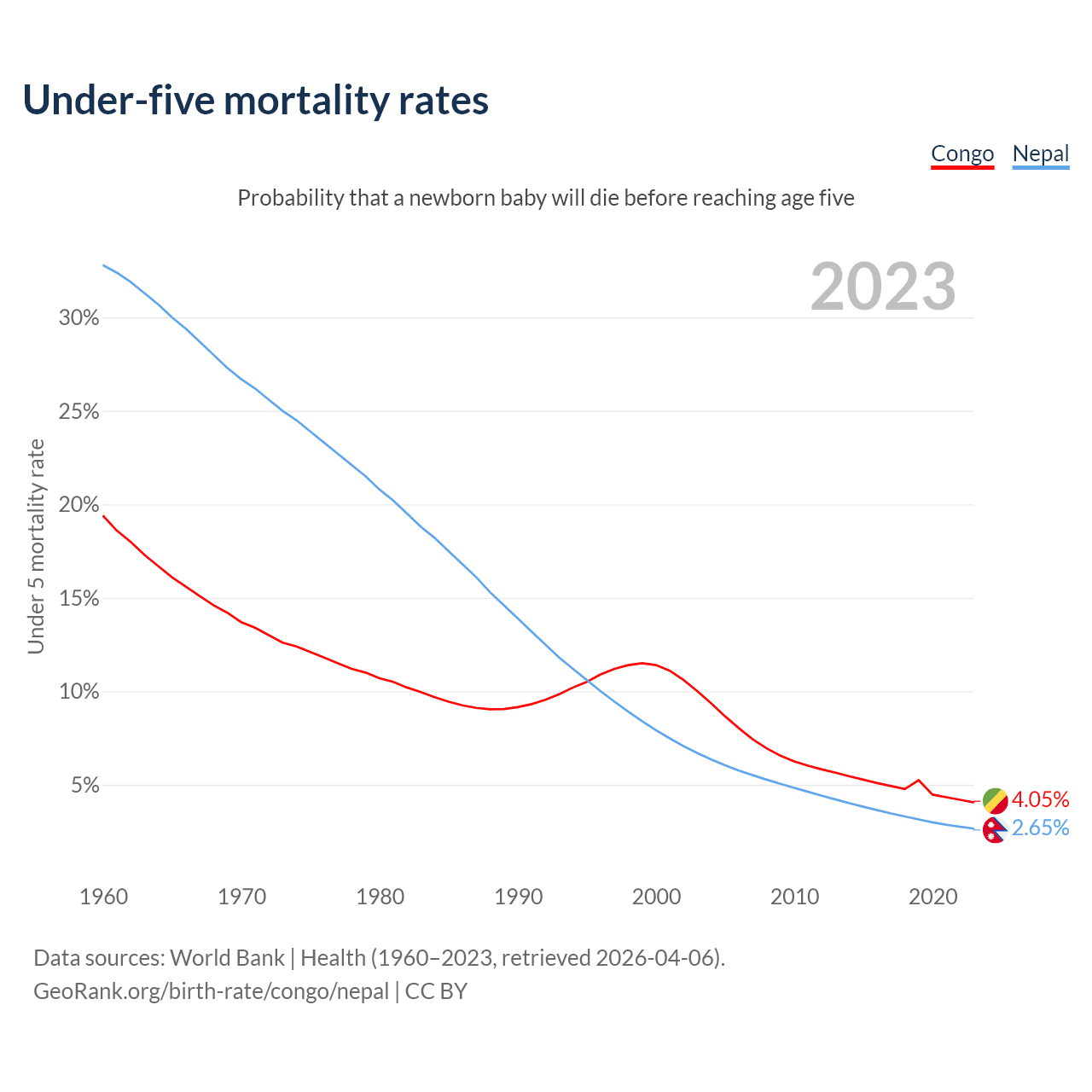 The chance that a newborn baby will die before reaching age five is 4.05% in the Congo and 2.65% in Nepal. Above is a chart with historical data on under-five mortality rates.