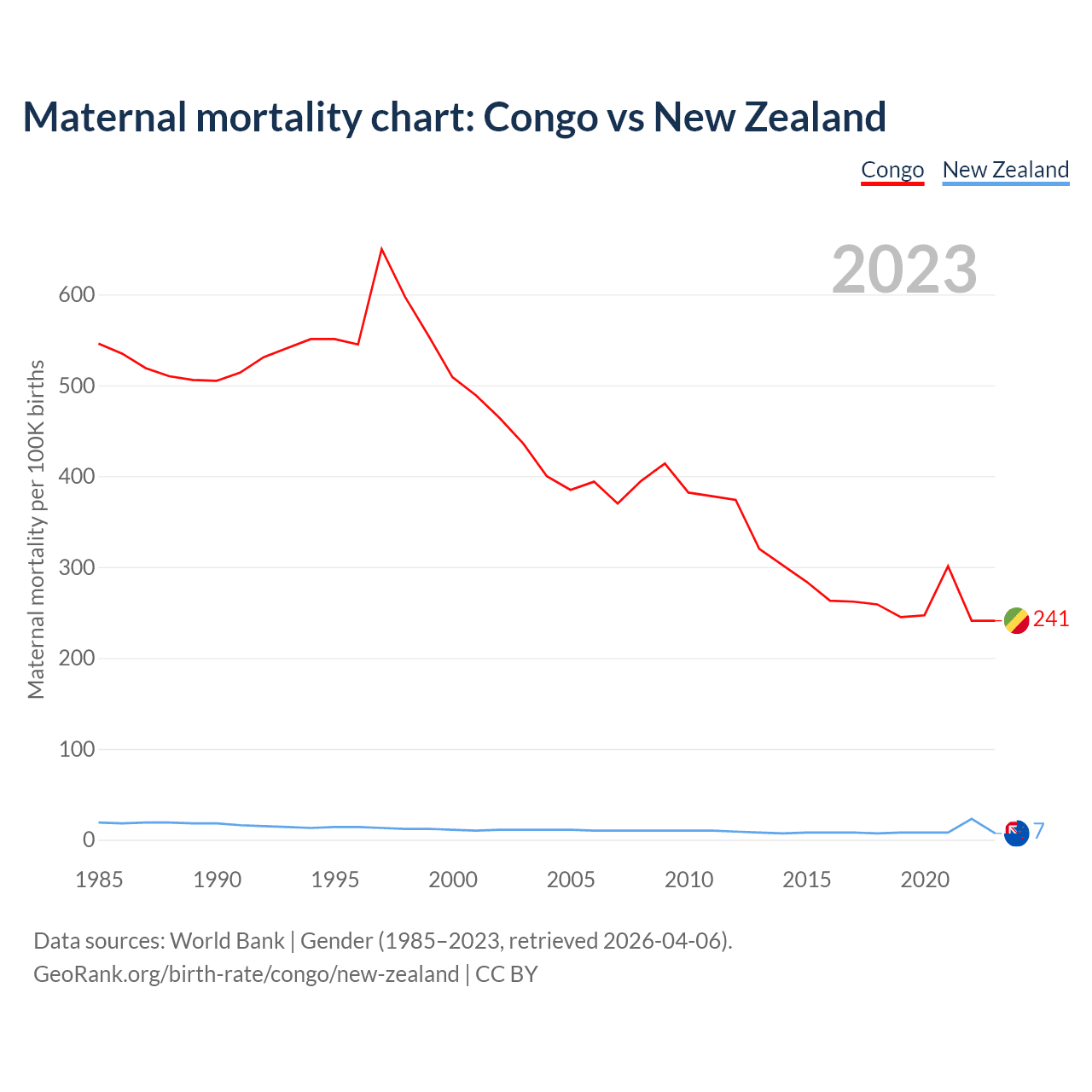The maternal mortality rate, which is the probability of dying during childbirth or within 42 days of pregnancy termination, is 241 deaths per 100,000 live births in the Congo, compared to 7 deaths in New Zealand.