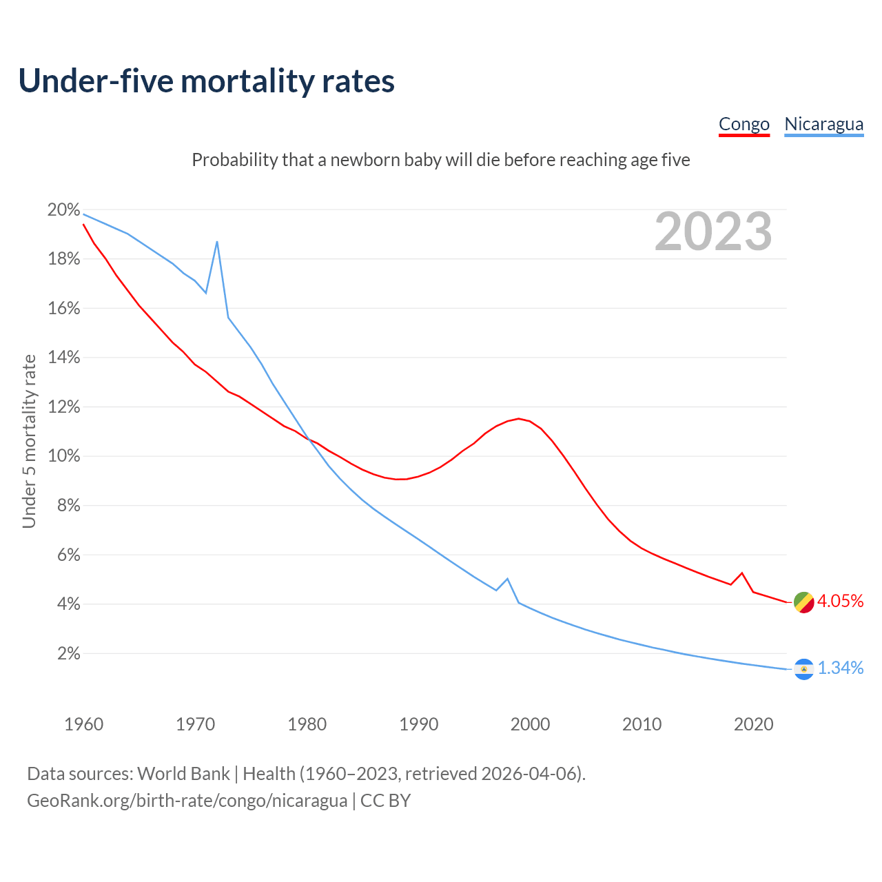 The chance that a newborn baby will die before reaching age five is 4.05% in the Congo and 1.34% in Nicaragua. Above is a chart with historical data on under-five mortality rates.
