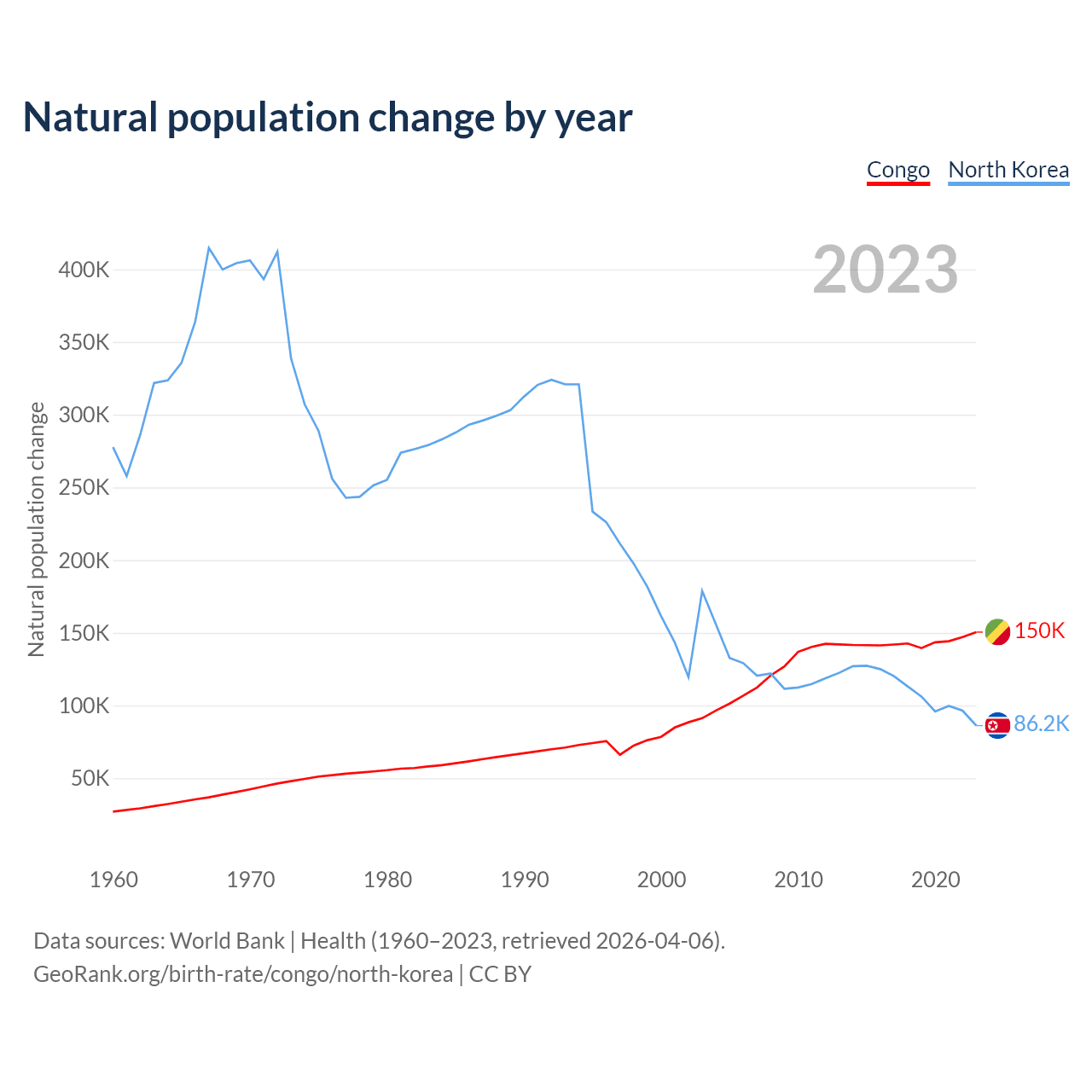 The Congo has an annual birth rate of 30.6 births per 1,000 people, compared to 12.9 for North Korea. The average number of children a woman is expected to have during her lifetime — the fertility rate, is 4.16 in the Congo and 1.78 in North Korea — 57.2% difference.