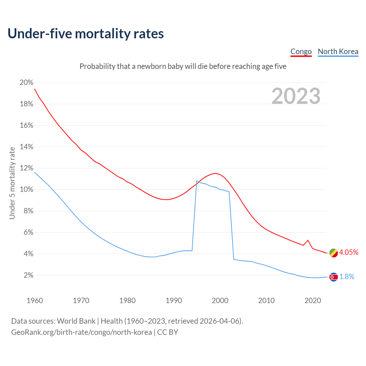 The chance that a newborn baby will die before reaching age five is 4.05% in the Congo and 1.8% in North Korea. Above is a chart with historical data on under-five mortality rates.