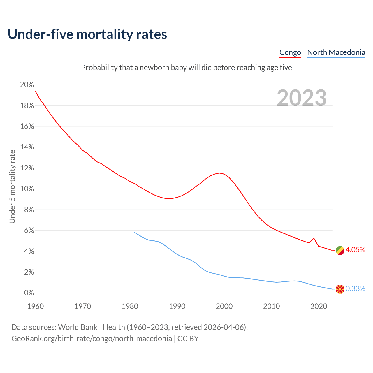 The chance that a newborn baby will die before reaching age five is 4.05% in the Congo and 0.33% in North Macedonia. Above is a chart with historical data on under-five mortality rates.