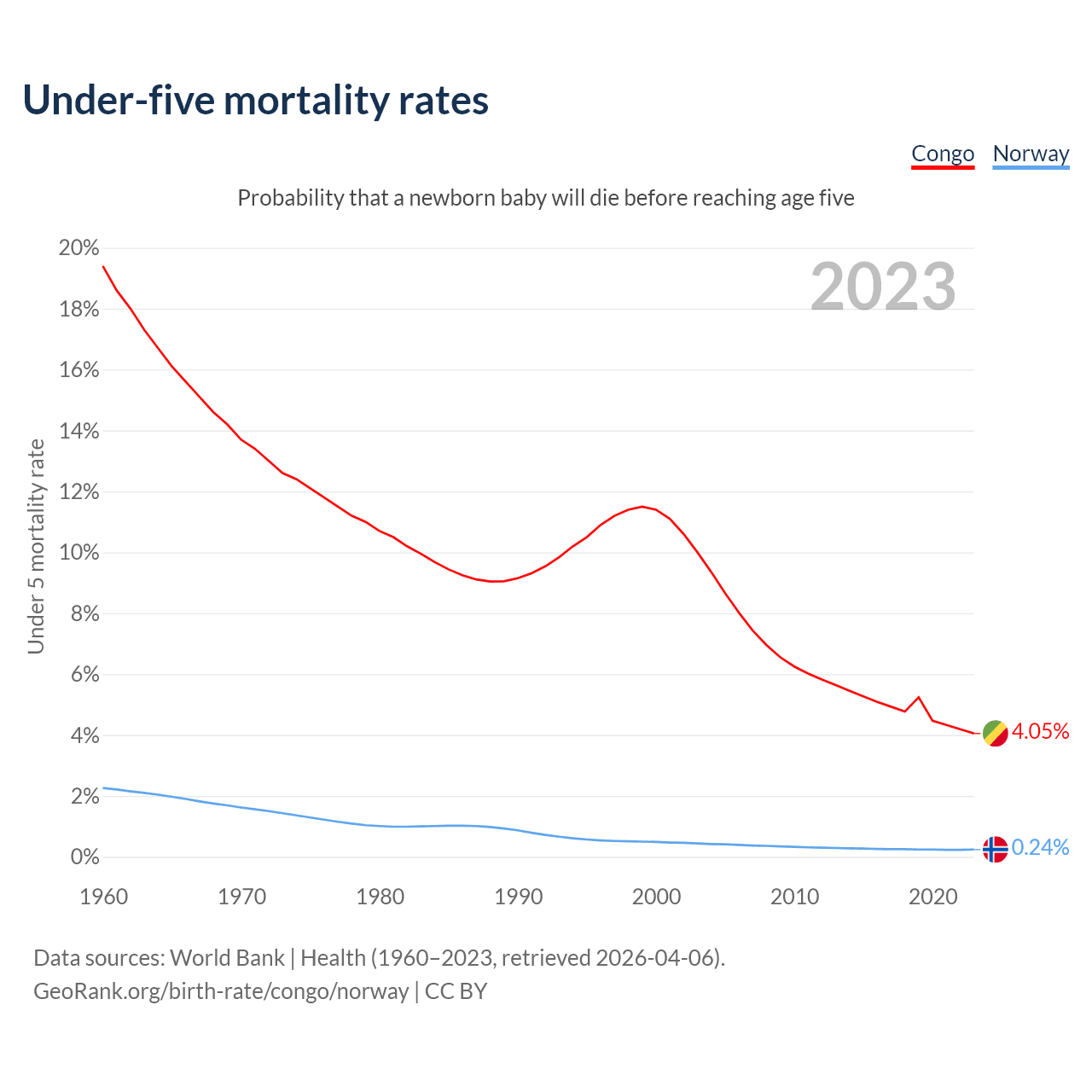 The chance that a newborn baby will die before reaching age five is 4.05% in the Congo and 0.24% in Norway. Above is a chart with historical data on under-five mortality rates.