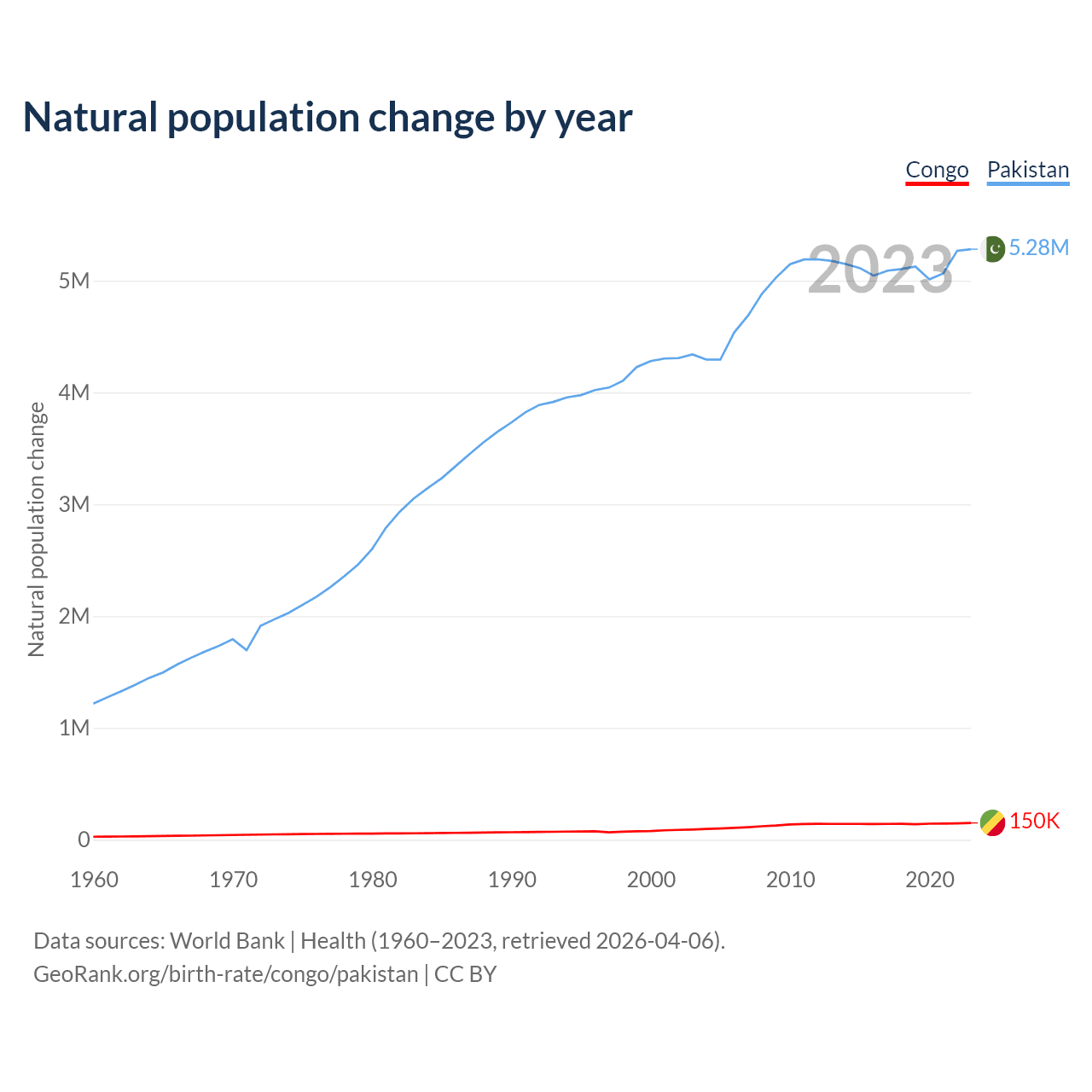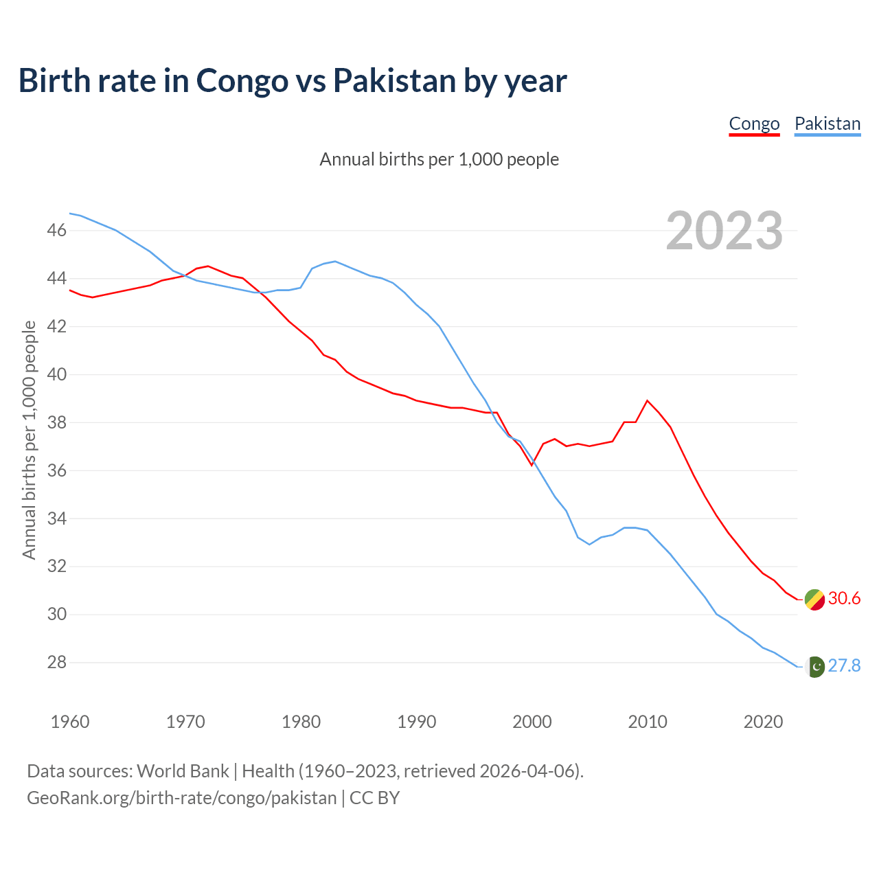 The Congo has an annual birth rate of 30.6 births per 1,000 people, compared to 27.8 for Pakistan. The average number of children a woman is expected to have during her lifetime — the fertility rate, is 4.16 in the Congo and 3.61 in Pakistan — 13.3% difference.