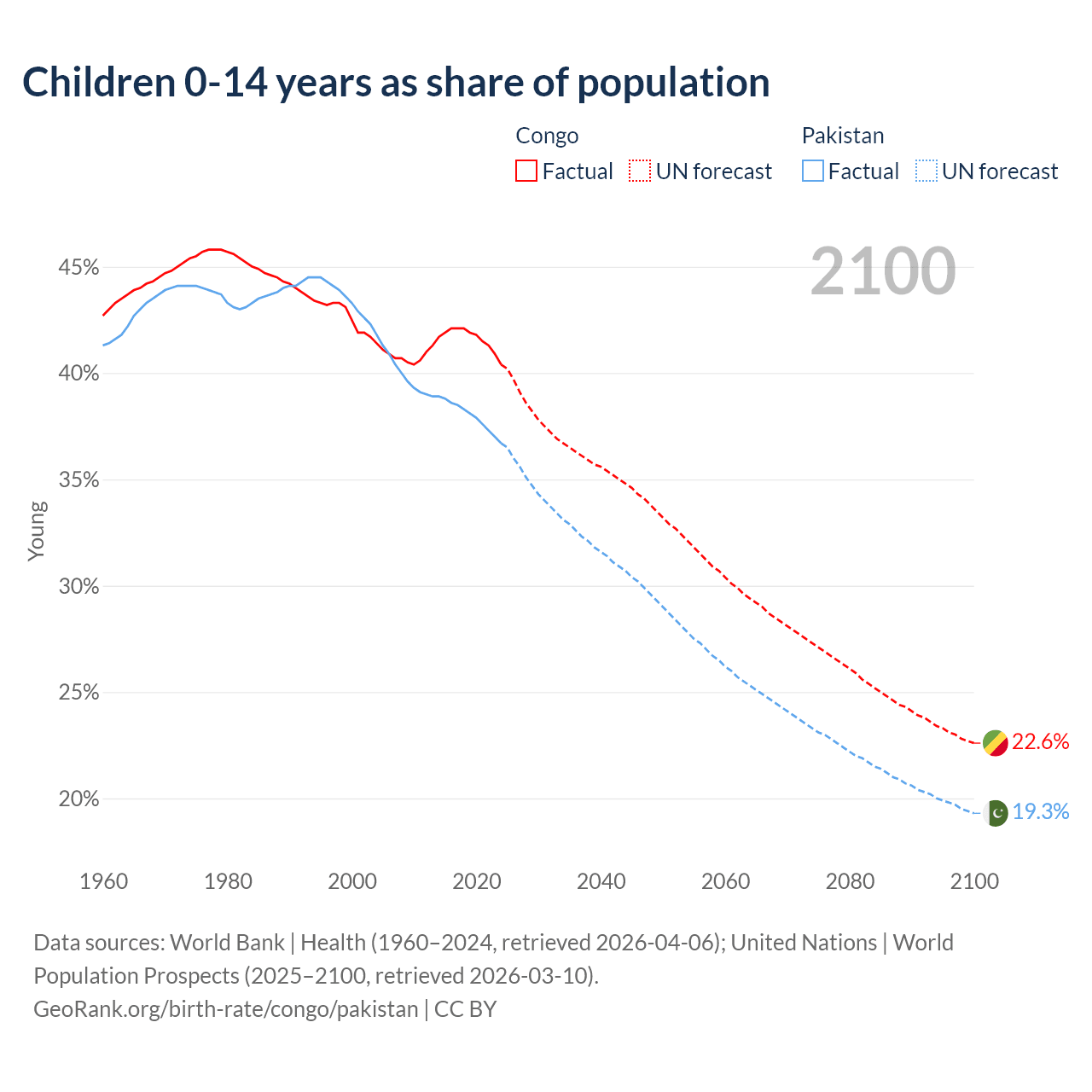 According to the latest available data on birth rates, the fertility rate in the Congo was 4.16 children per woman in 2023, compared to 3.61 in Pakistan in 2023. The replacement level is considered to be 2.1 children per woman.