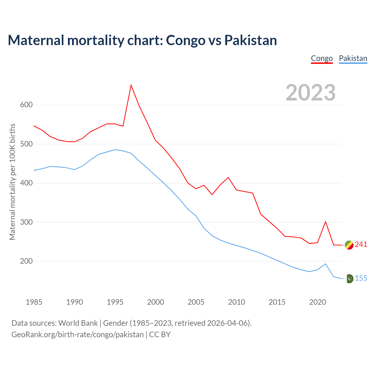 The maternal mortality rate, which is the probability of dying during childbirth or within 42 days of pregnancy termination, is 241 deaths per 100,000 live births in the Congo, compared to 155 deaths in Pakistan.