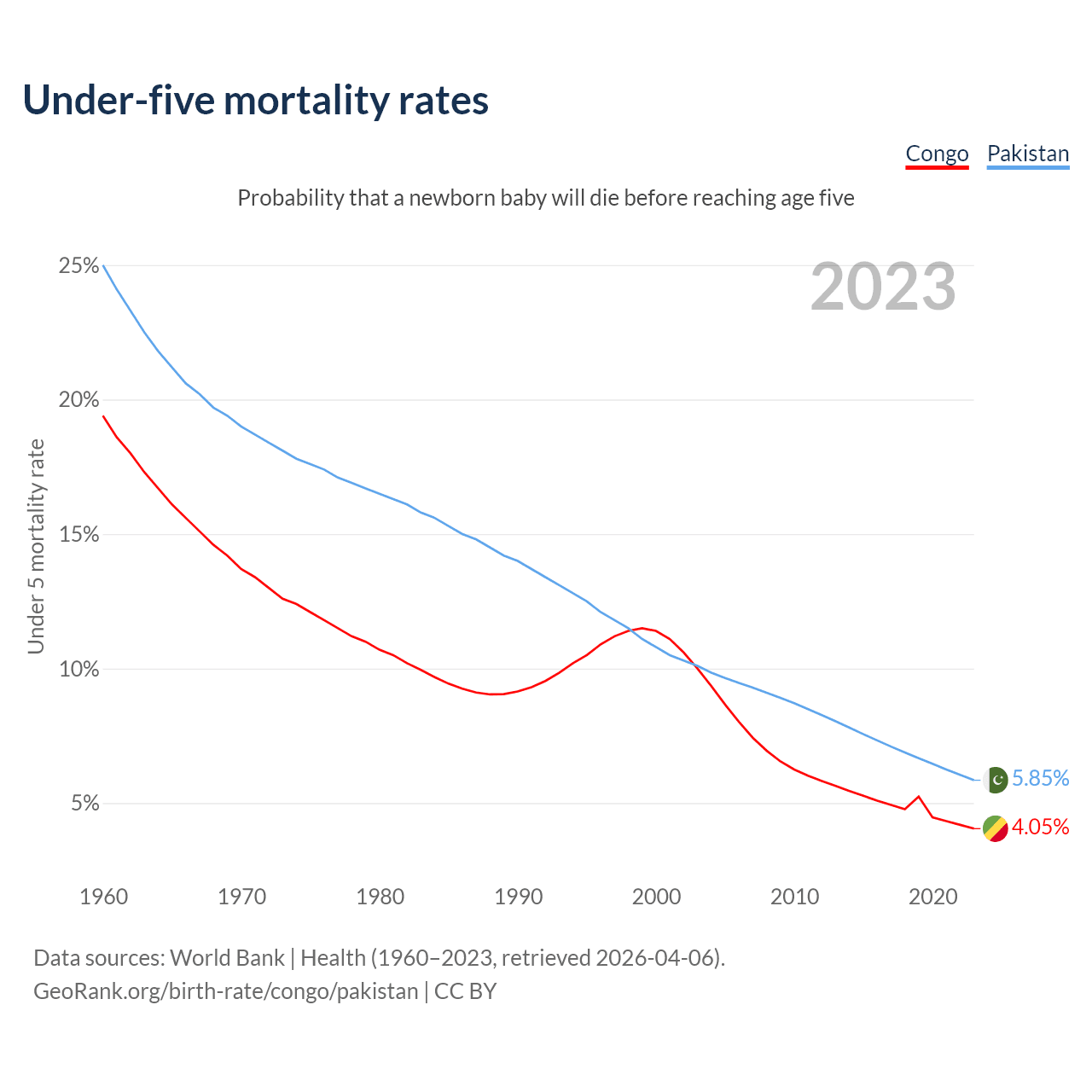 The chance that a newborn baby will die before reaching age five is 4.05% in the Congo and 5.85% in Pakistan. Above is a chart with historical data on under-five mortality rates.