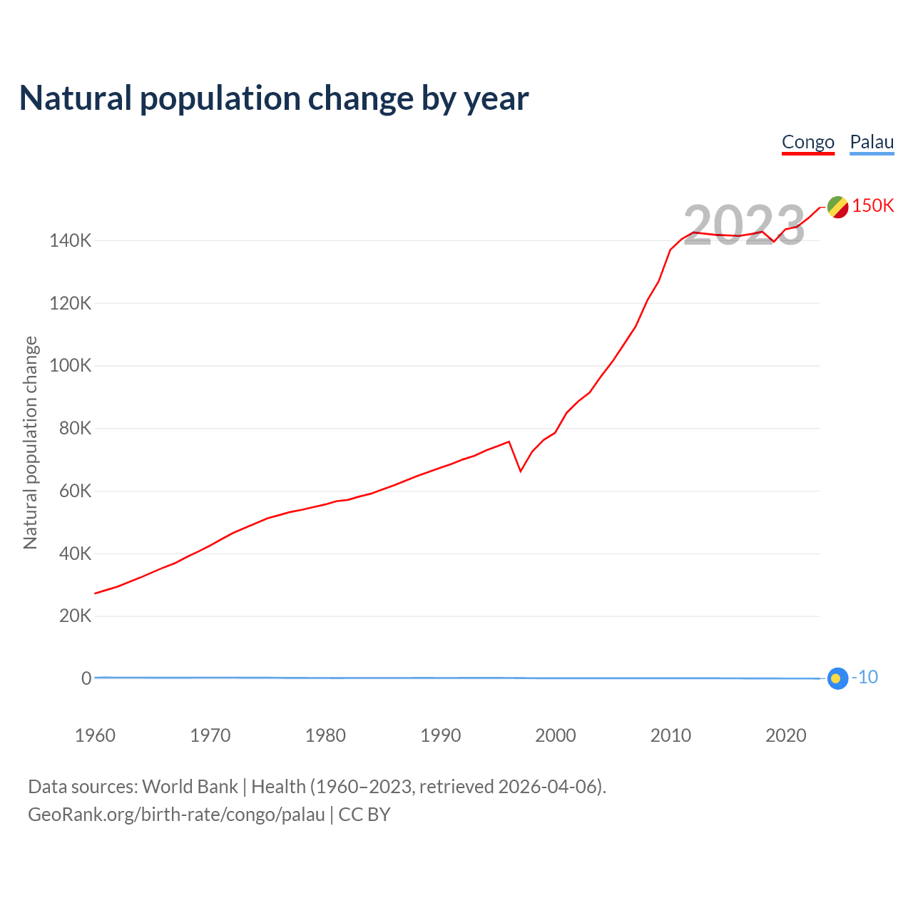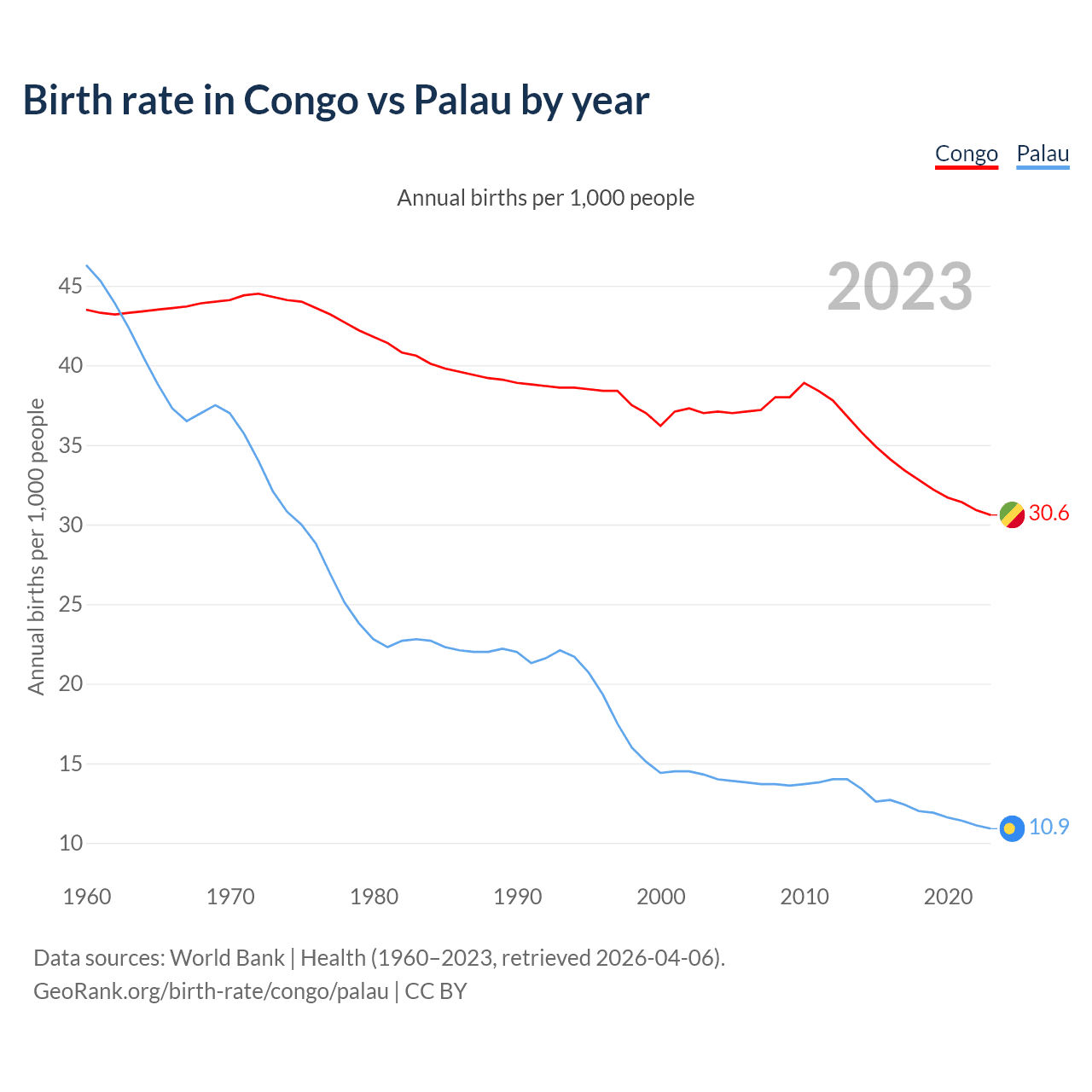 The Congo has an annual birth rate of 30.6 births per 1,000 people, compared to 10.9 for Palau. The average number of children a woman is expected to have during her lifetime — the fertility rate, is 4.16 in the Congo and 1.91 in Palau — 54.1% difference.