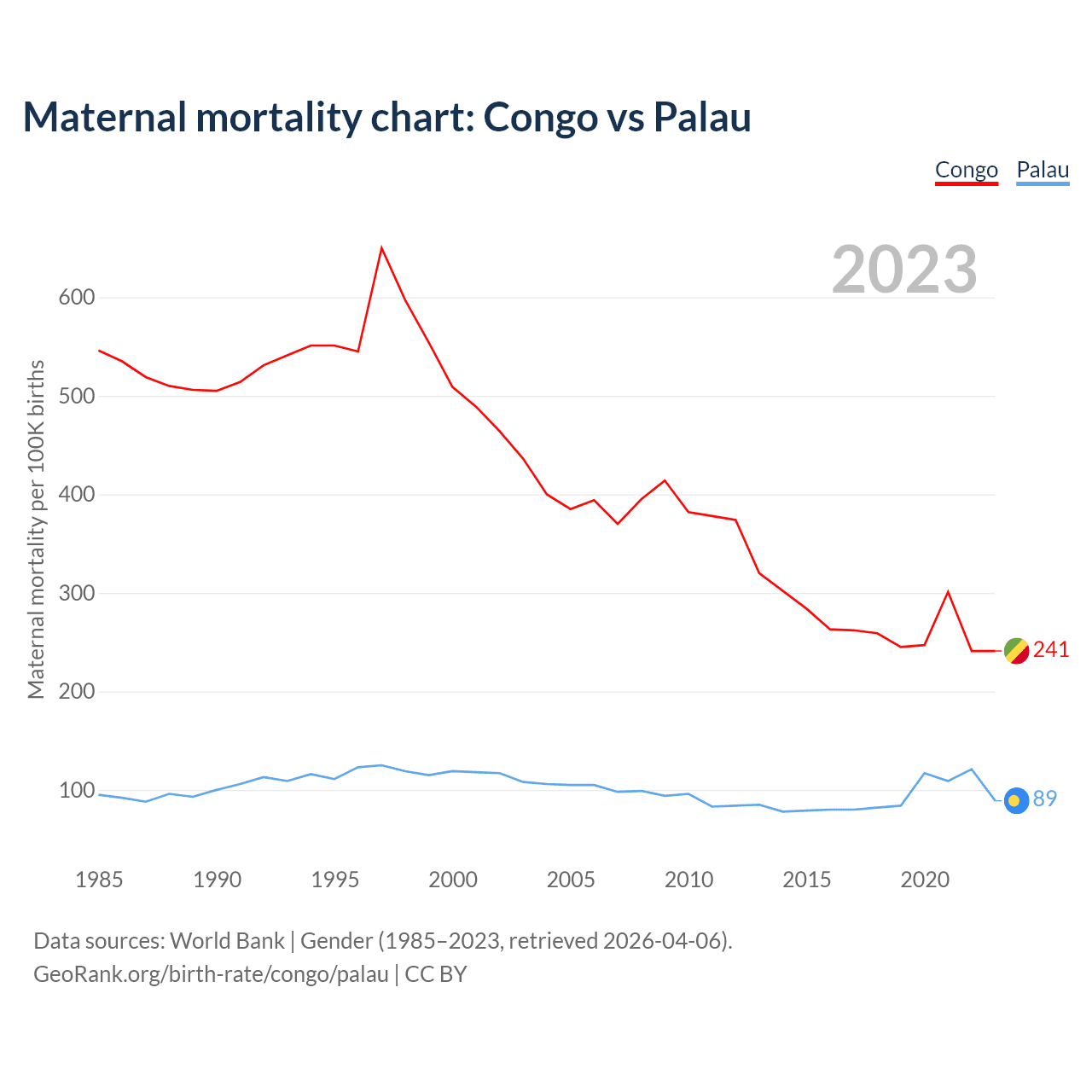 The maternal mortality rate, which is the probability of dying during childbirth or within 42 days of pregnancy termination, is 241 deaths per 100,000 live births in the Congo, compared to 89 deaths in Palau.