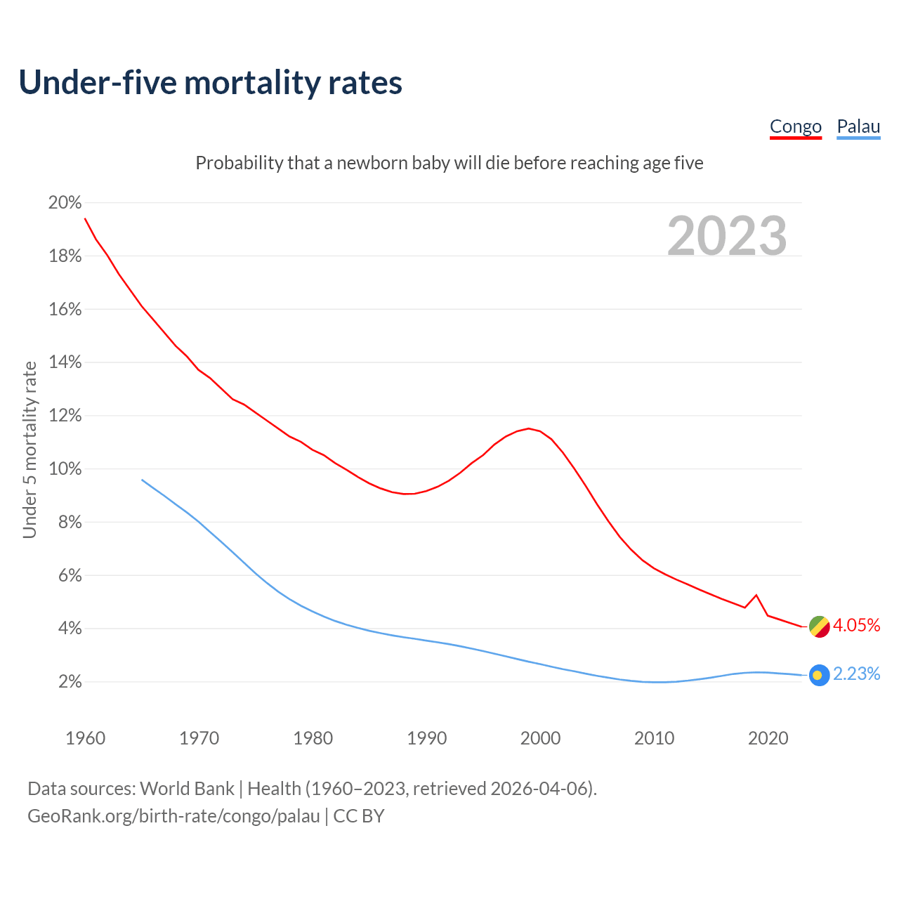 The chance that a newborn baby will die before reaching age five is 4.05% in the Congo and 2.23% in Palau. Above is a chart with historical data on under-five mortality rates.