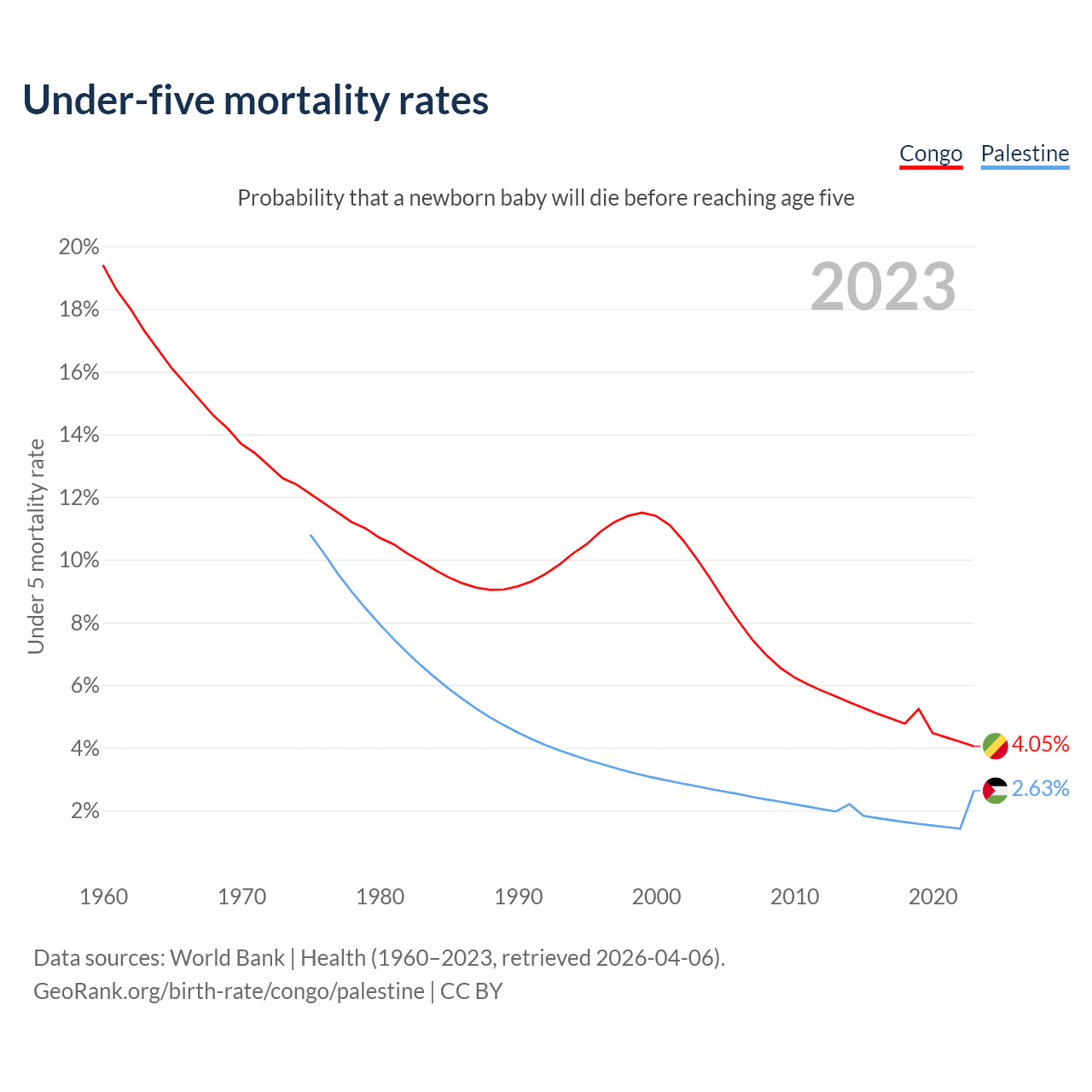 The chance that a newborn baby will die before reaching age five is 4.05% in the Congo and 2.63% in Palestine. Above is a chart with historical data on under-five mortality rates.