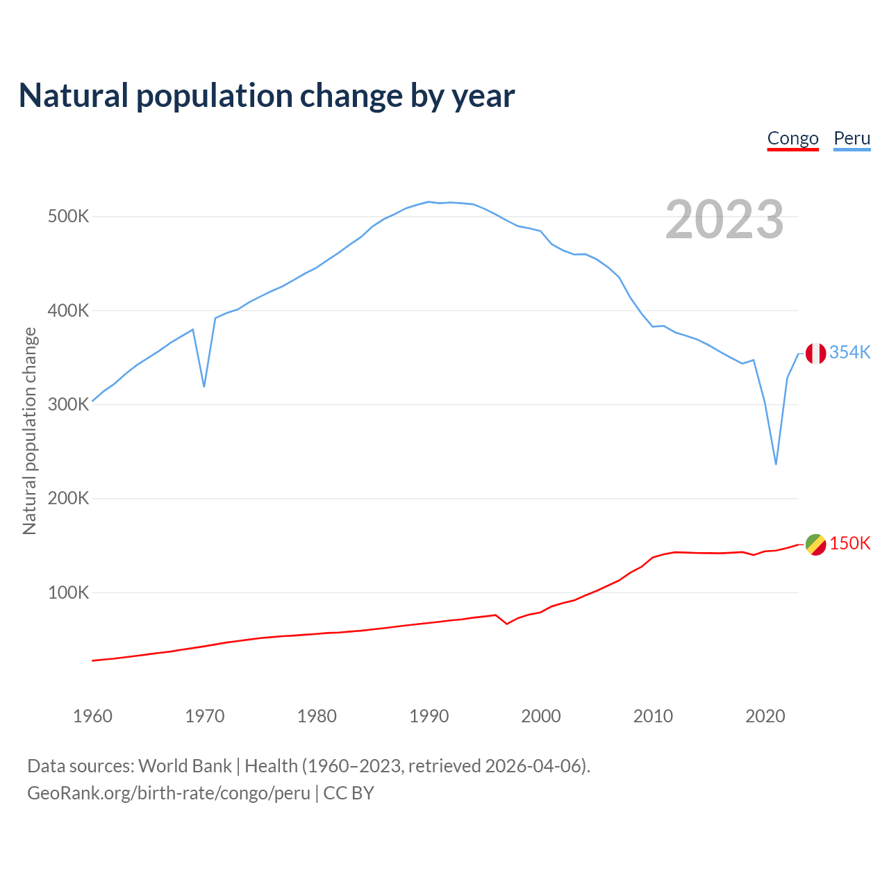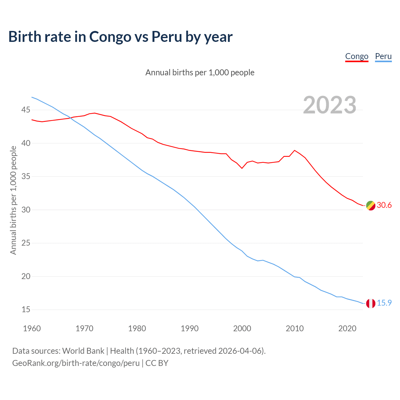 The Congo has an annual birth rate of 30.6 births per 1,000 people, compared to 15.9 for Peru. The average number of children a woman is expected to have during her lifetime — the fertility rate, is 4.16 in the Congo and 1.98 in Peru — 52.4% difference.