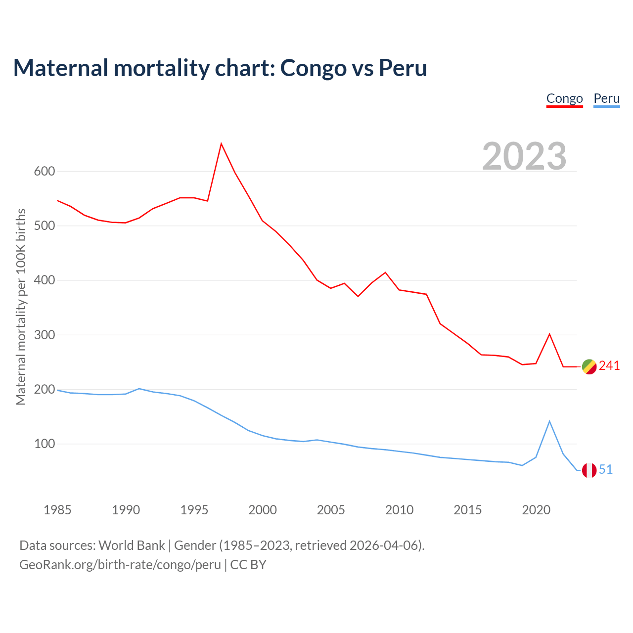 The maternal mortality rate, which is the probability of dying during childbirth or within 42 days of pregnancy termination, is 241 deaths per 100,000 live births in the Congo, compared to 51 deaths in Peru.