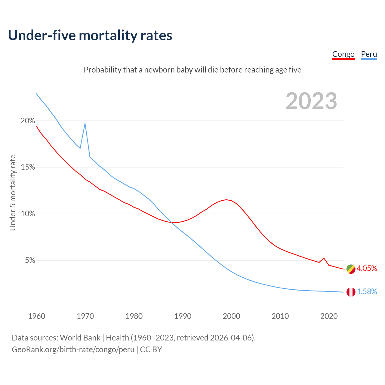 The chance that a newborn baby will die before reaching age five is 4.05% in the Congo and 1.58% in Peru. Above is a chart with historical data on under-five mortality rates.