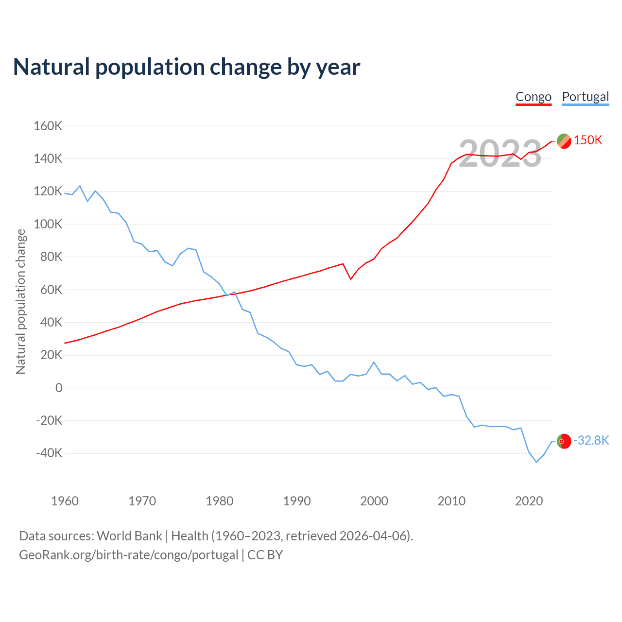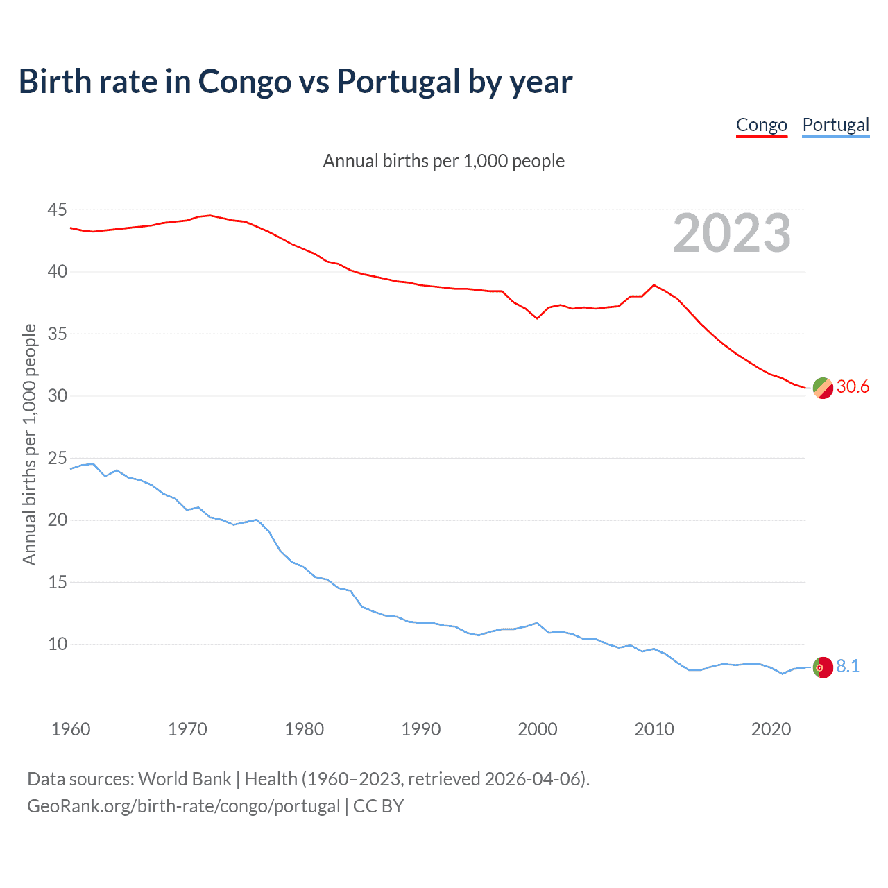 The Congo has an annual birth rate of 30.6 births per 1,000 people, compared to 8.1 for Portugal. The average number of children a woman is expected to have during her lifetime — the fertility rate, is 4.16 in the Congo and 1.44 in Portugal — 65.4% difference.