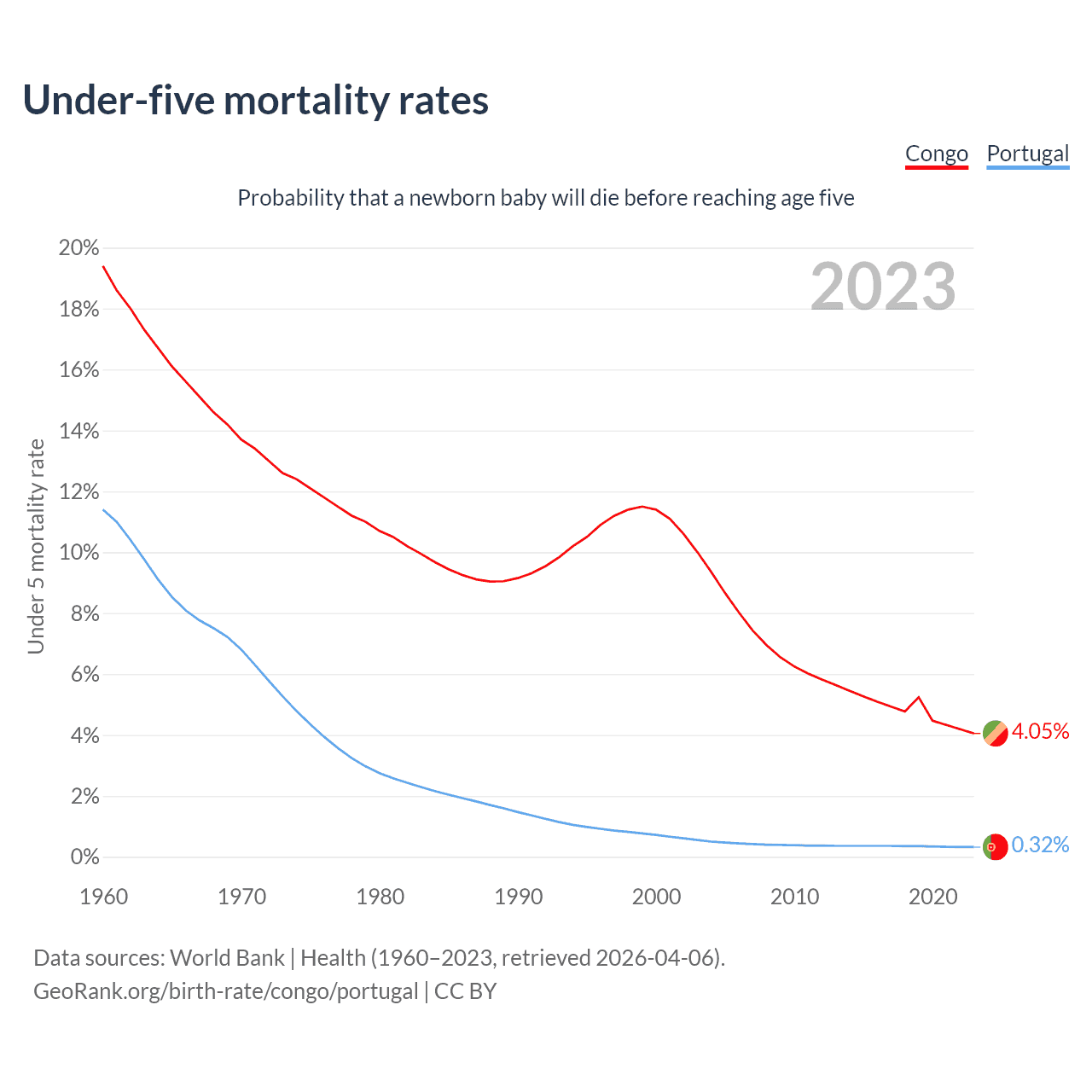 The chance that a newborn baby will die before reaching age five is 4.05% in the Congo and 0.32% in Portugal. Above is a chart with historical data on under-five mortality rates.