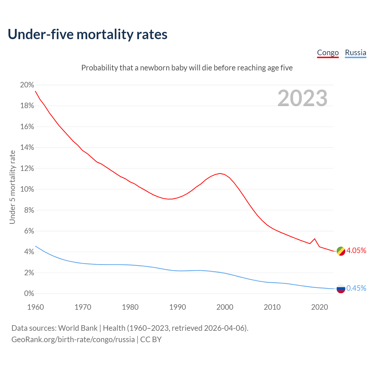 The chance that a newborn baby will die before reaching age five is 4.05% in the Congo and 0.45% in Russia. Above is a chart with historical data on under-five mortality rates.