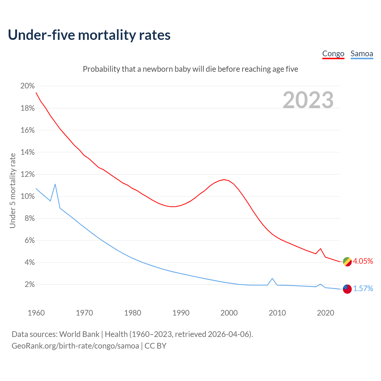The chance that a newborn baby will die before reaching age five is 4.05% in the Congo and 1.57% in Samoa. Above is a chart with historical data on under-five mortality rates.