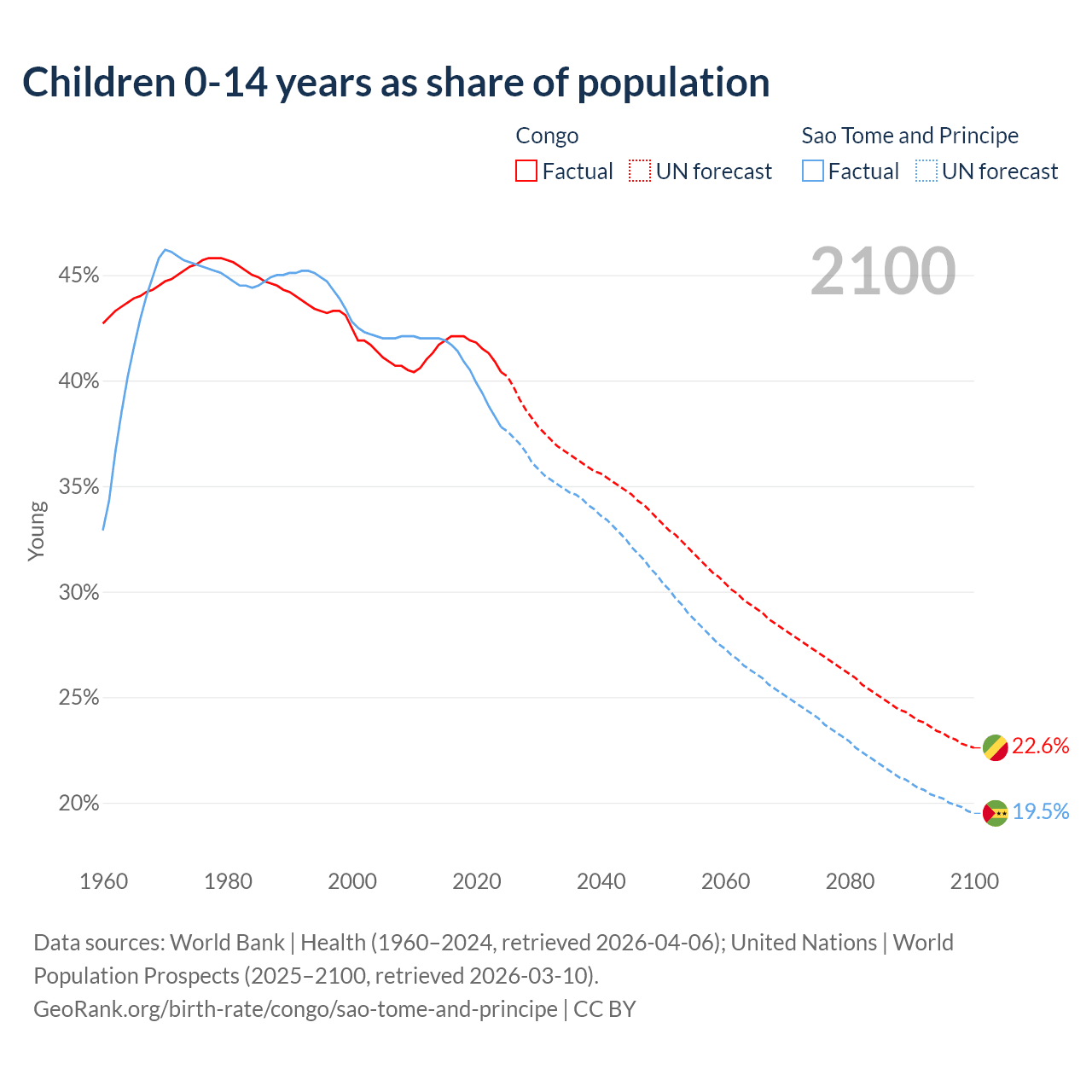 According to the latest available data on birth rates, the fertility rate in the Congo was 4.16 children per woman in 2023, compared to 3.64 in Sao Tome and Principe in 2023. The replacement level is considered to be 2.1 children per woman.
