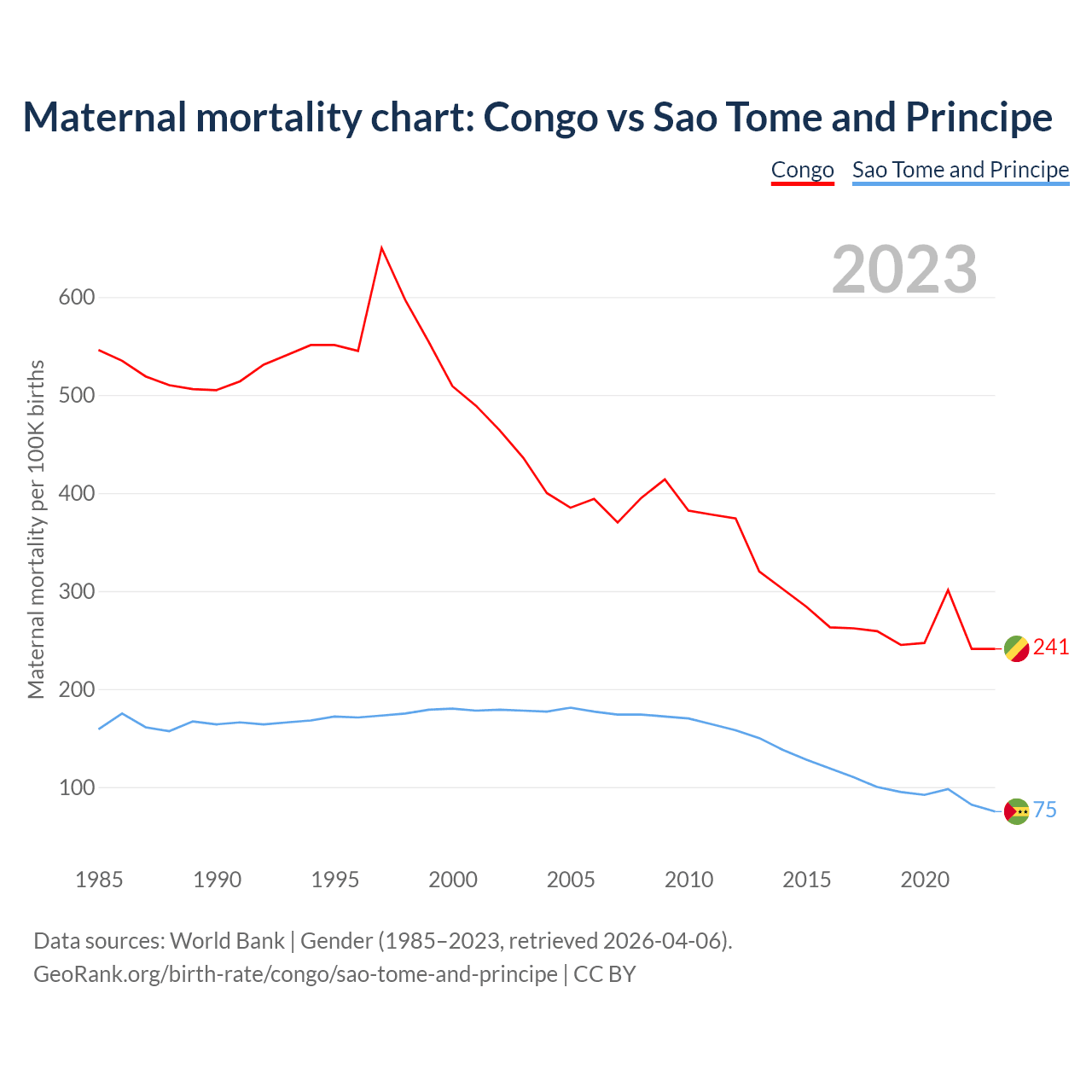 The maternal mortality rate, which is the probability of dying during childbirth or within 42 days of pregnancy termination, is 241 deaths per 100,000 live births in the Congo, compared to 75 deaths in Sao Tome and Principe.