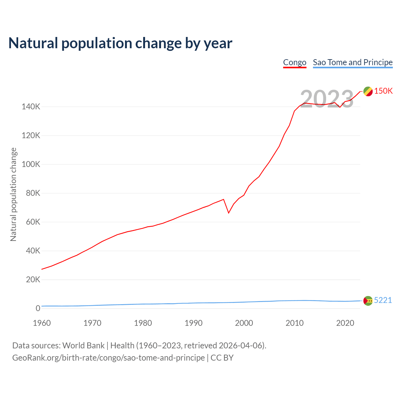 The Congo has an annual birth rate of 30.6 births per 1,000 people, compared to 28.2 for Sao Tome and Principe. The average number of children a woman is expected to have during her lifetime — the fertility rate, is 4.16 in the Congo and 3.64 in Sao Tome and Principe — 12.3% difference.