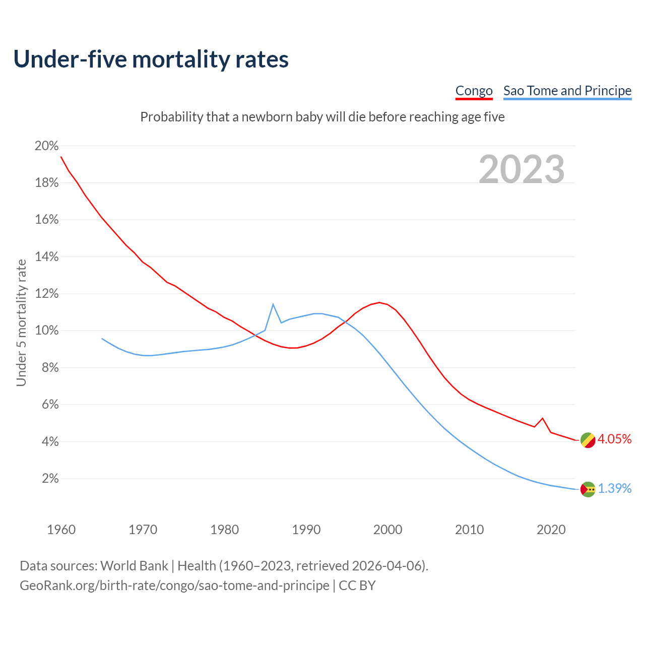 The chance that a newborn baby will die before reaching age five is 4.05% in the Congo and 1.39% in Sao Tome and Principe. Above is a chart with historical data on under-five mortality rates.