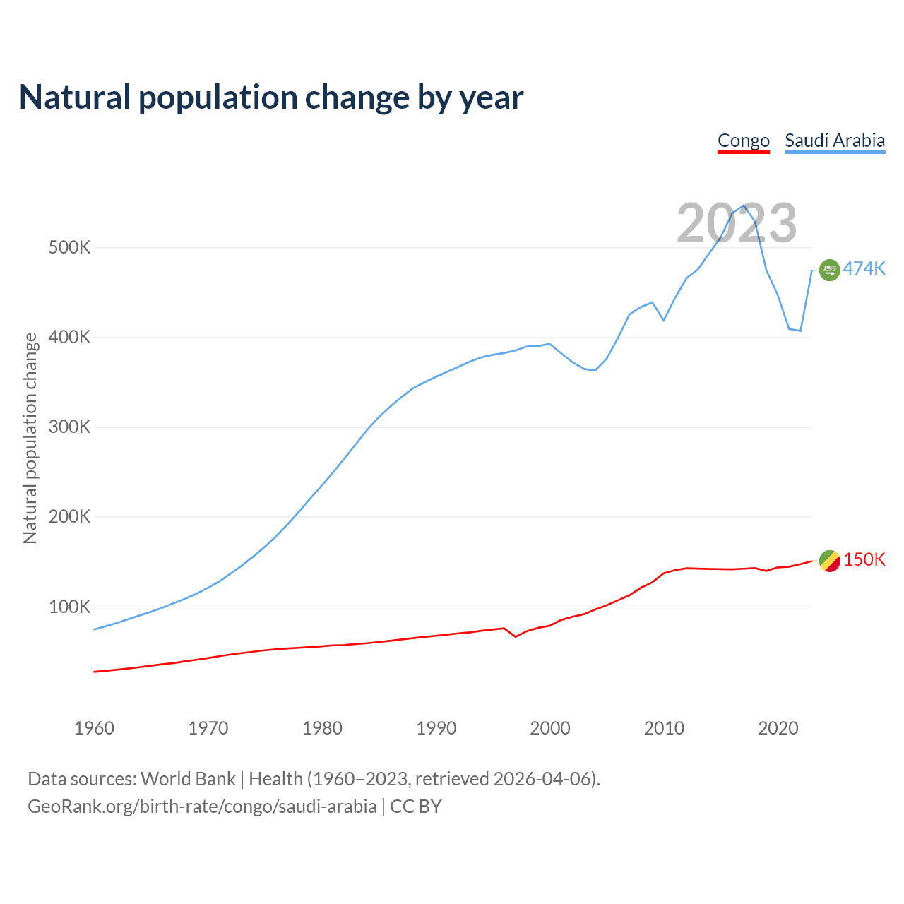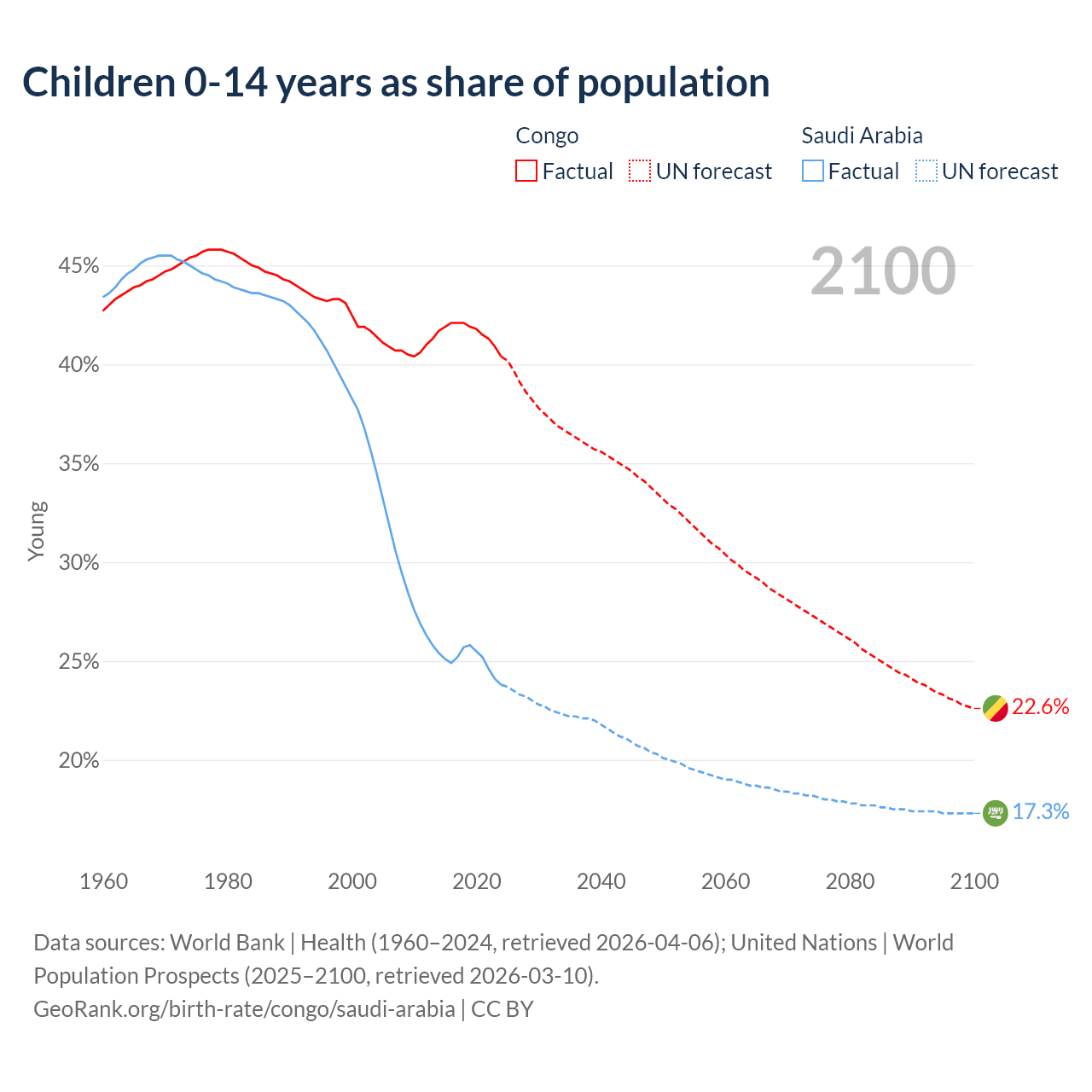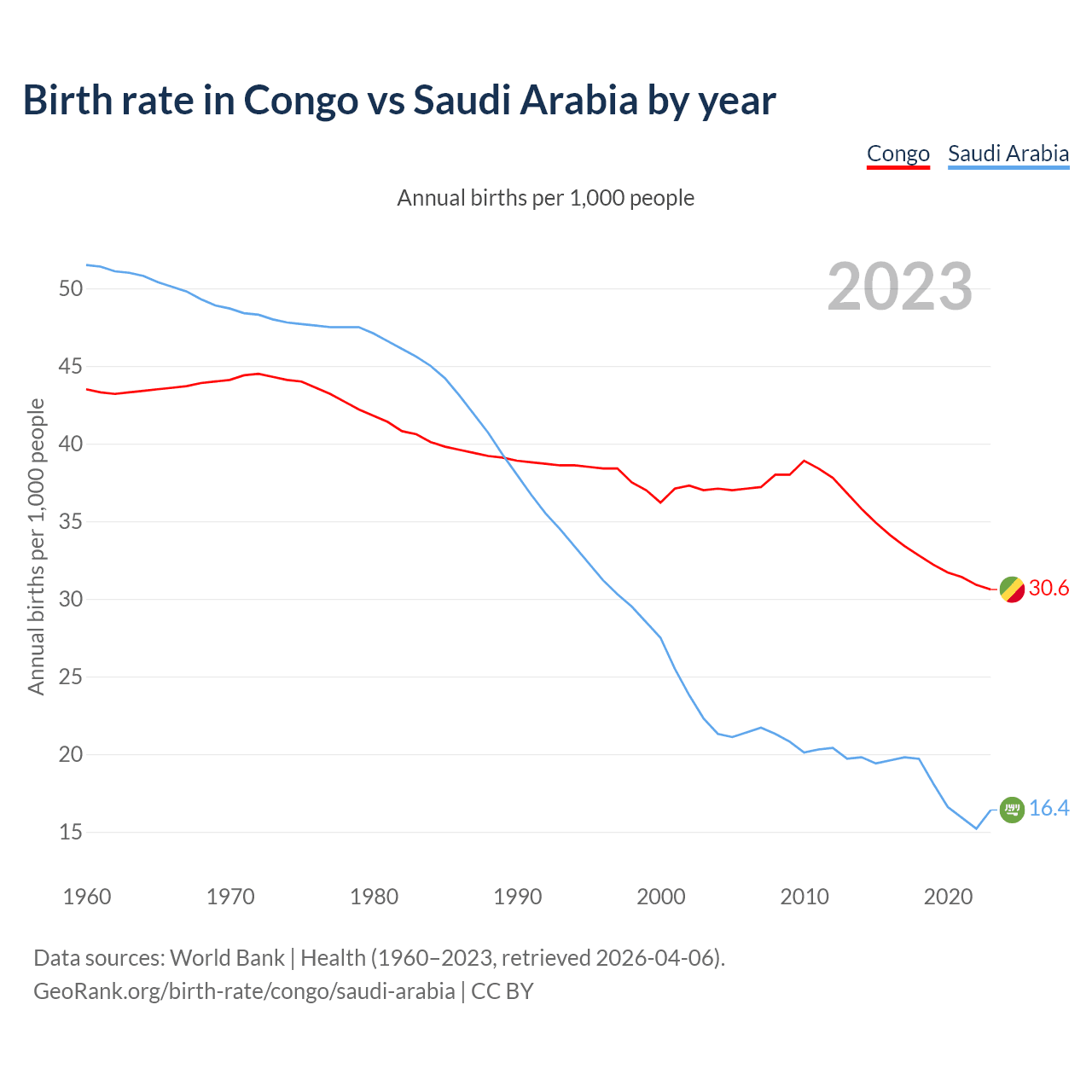 The Congo has an annual birth rate of 30.6 births per 1,000 people, compared to 16.4 for Saudi Arabia. The average number of children a woman is expected to have during her lifetime — the fertility rate, is 4.16 in the Congo and 2.28 in Saudi Arabia — 45.2% difference.