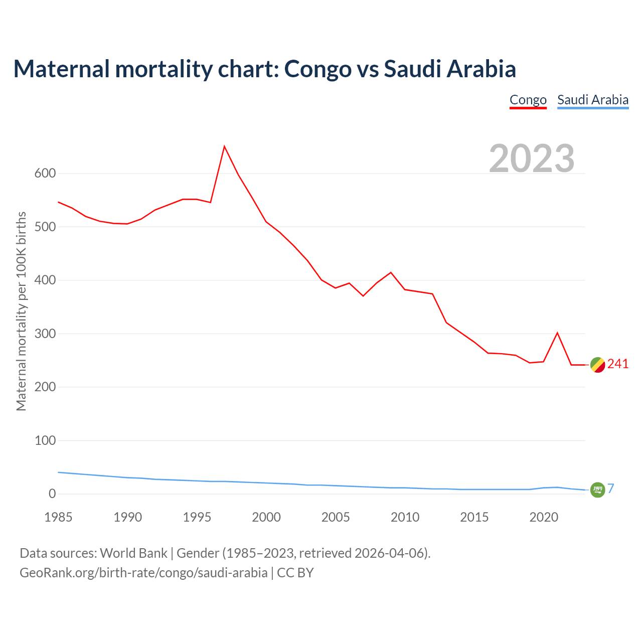 The maternal mortality rate, which is the probability of dying during childbirth or within 42 days of pregnancy termination, is 241 deaths per 100,000 live births in the Congo, compared to 7 deaths in Saudi Arabia.