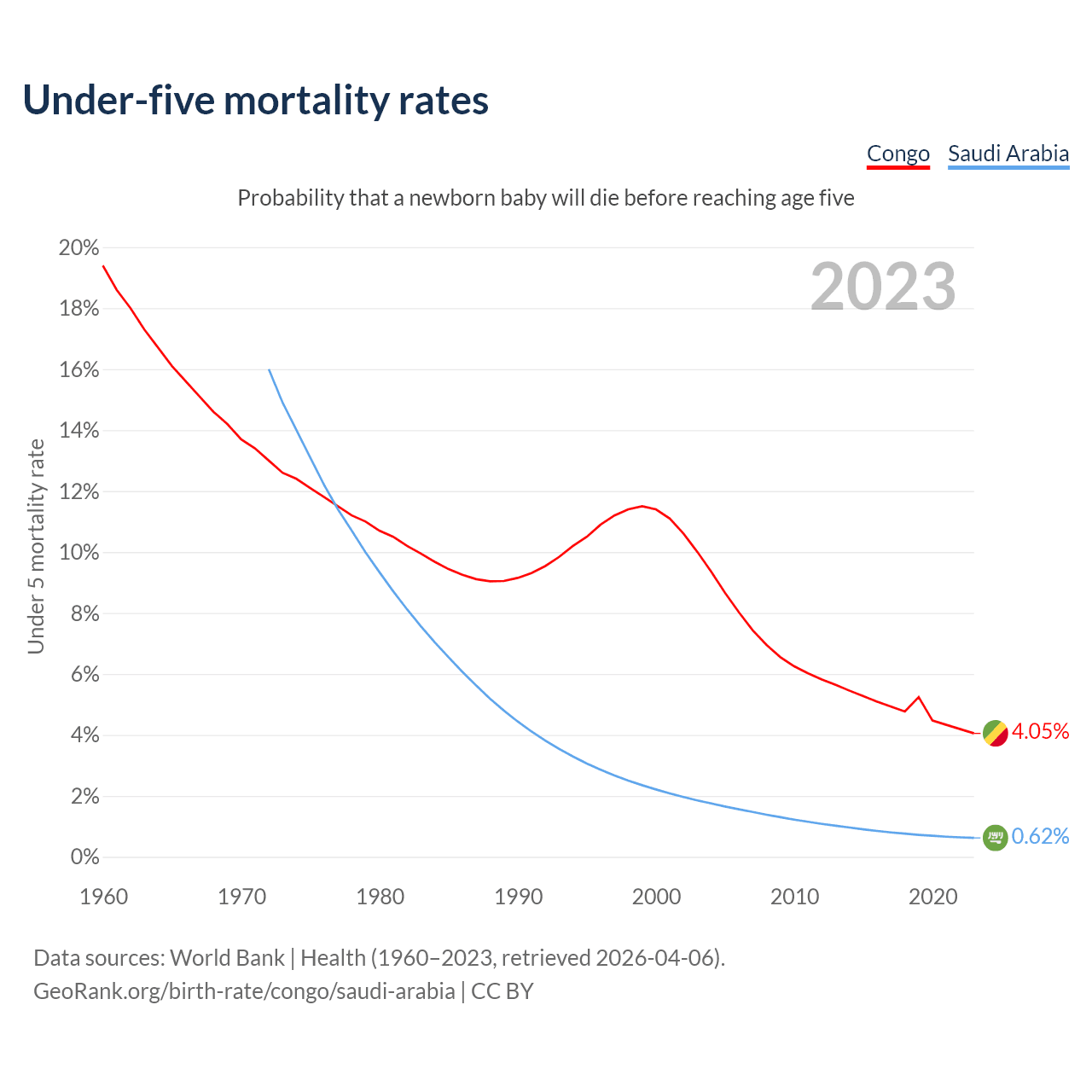 The chance that a newborn baby will die before reaching age five is 4.05% in the Congo and 0.62% in Saudi Arabia. Above is a chart with historical data on under-five mortality rates.
