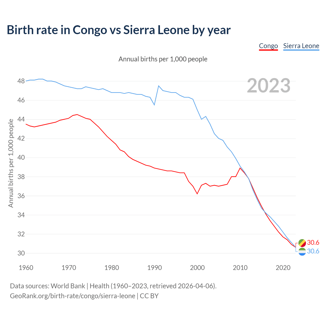 The Congo has an annual birth rate of 30.6 births per 1,000 people, compared to 30.6 for Sierra Leone. The average number of children a woman is expected to have during her lifetime — the fertility rate, is 4.16 in the Congo and 3.79 in Sierra Leone — 8.8% difference.