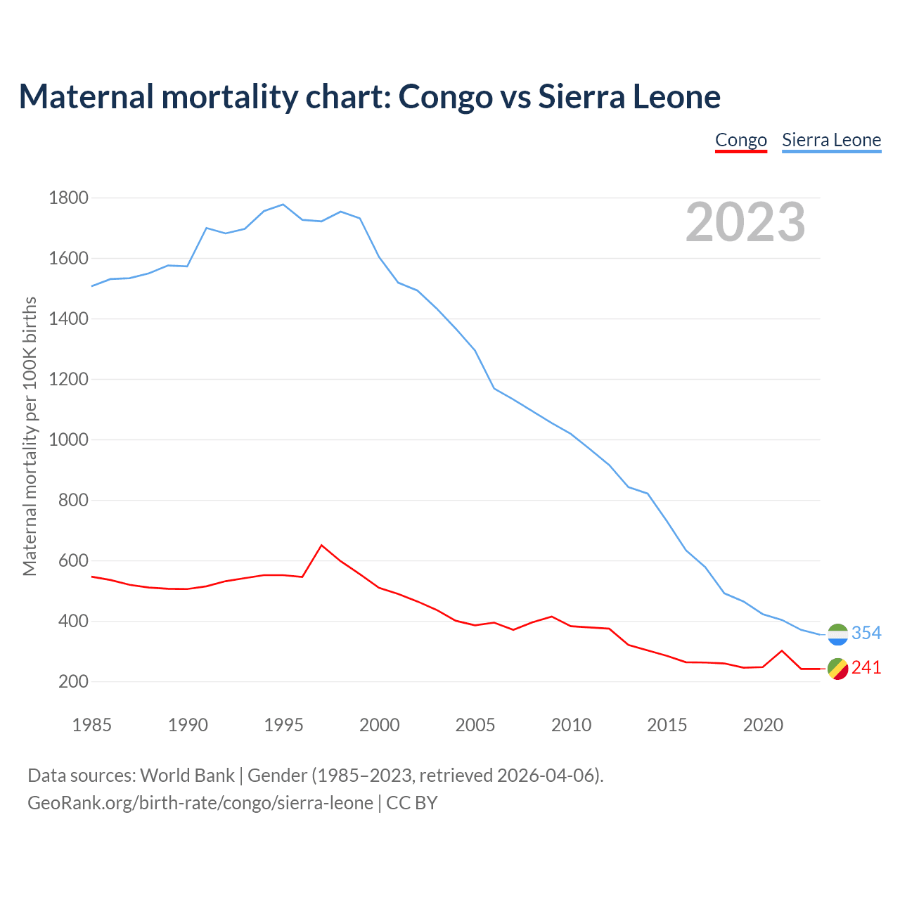 The maternal mortality rate, which is the probability of dying during childbirth or within 42 days of pregnancy termination, is 241 deaths per 100,000 live births in the Congo, compared to 354 deaths in Sierra Leone.