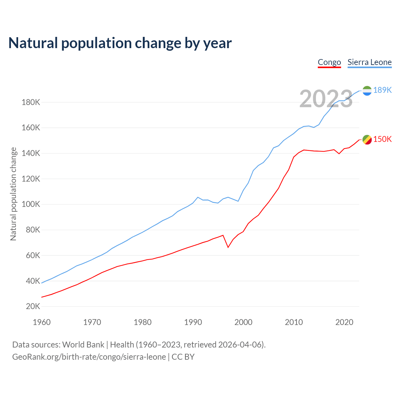 According to the latest available data on birth rates, the fertility rate in the Congo was 4.16 children per woman in 2023, compared to 3.79 in Sierra Leone in 2023. The replacement level is considered to be 2.1 children per woman.