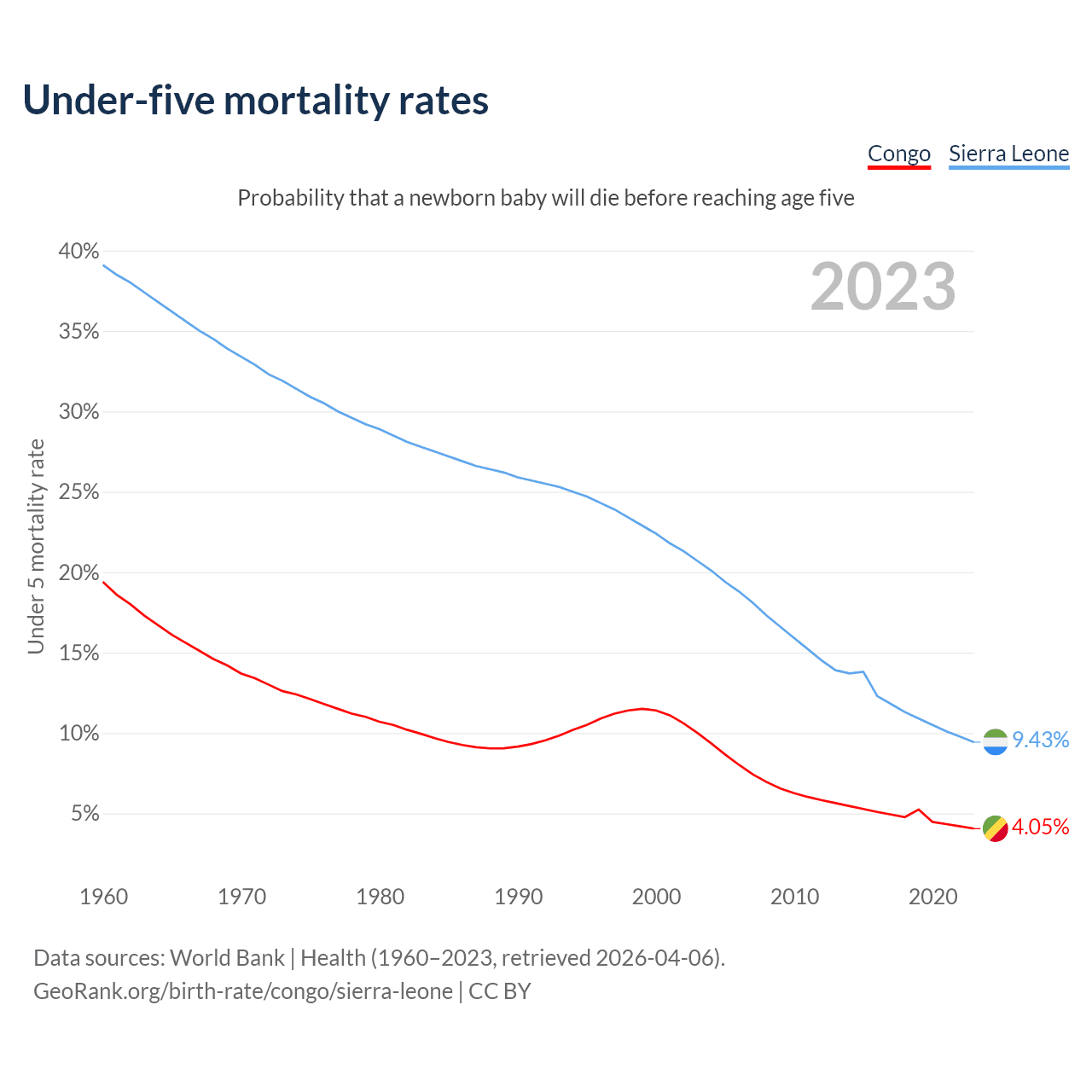 The chance that a newborn baby will die before reaching age five is 4.05% in the Congo and 9.43% in Sierra Leone. Above is a chart with historical data on under-five mortality rates.