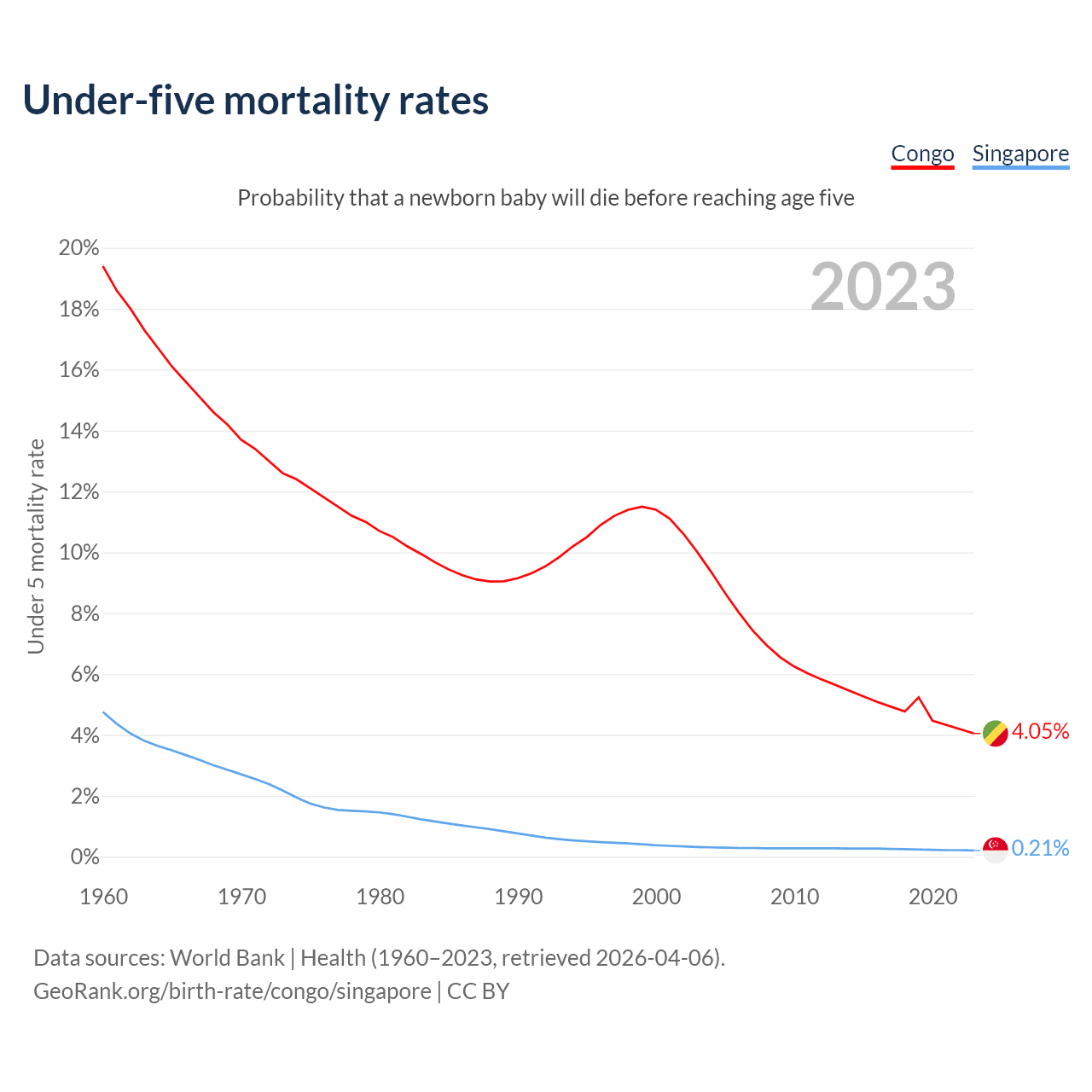 The chance that a newborn baby will die before reaching age five is 4.05% in the Congo and 0.21% in Singapore. Above is a chart with historical data on under-five mortality rates.