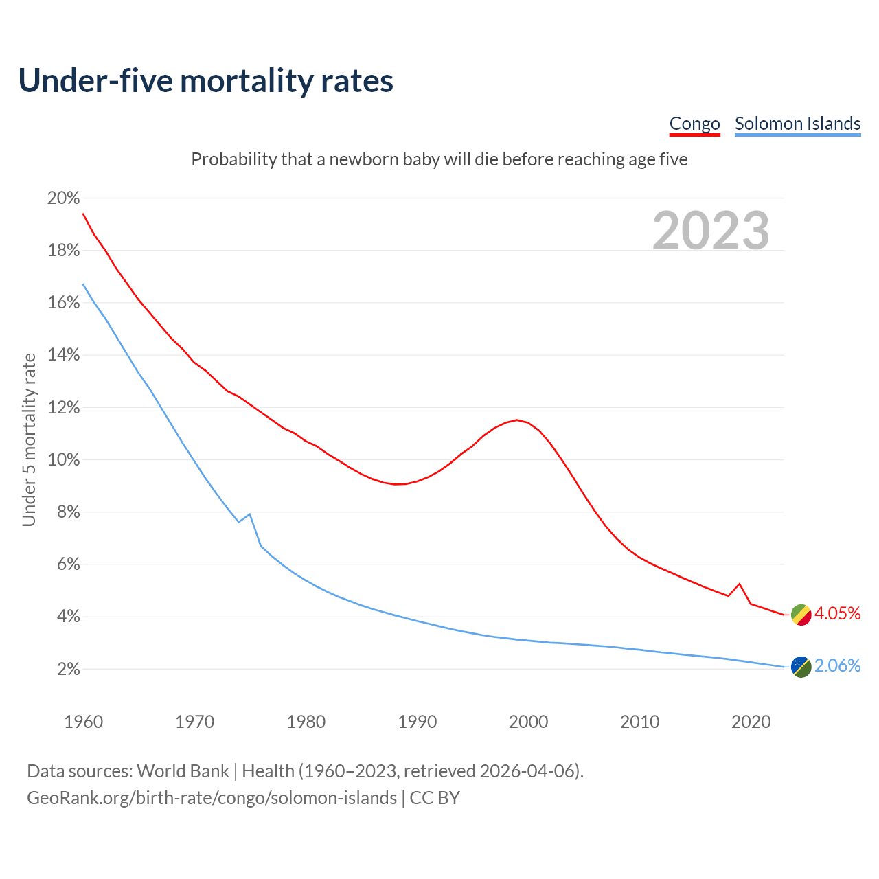 The chance that a newborn baby will die before reaching age five is 4.05% in the Congo and 2.06% in the Solomon Islands. Above is a chart with historical data on under-five mortality rates.