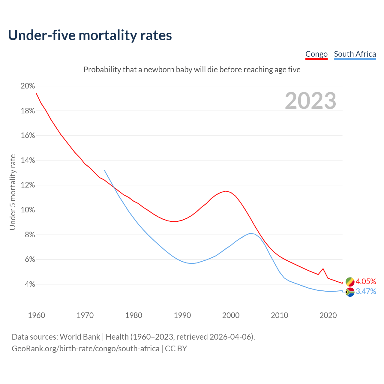The chance that a newborn baby will die before reaching age five is 4.05% in the Congo and 3.47% in South Africa. Above is a chart with historical data on under-five mortality rates.