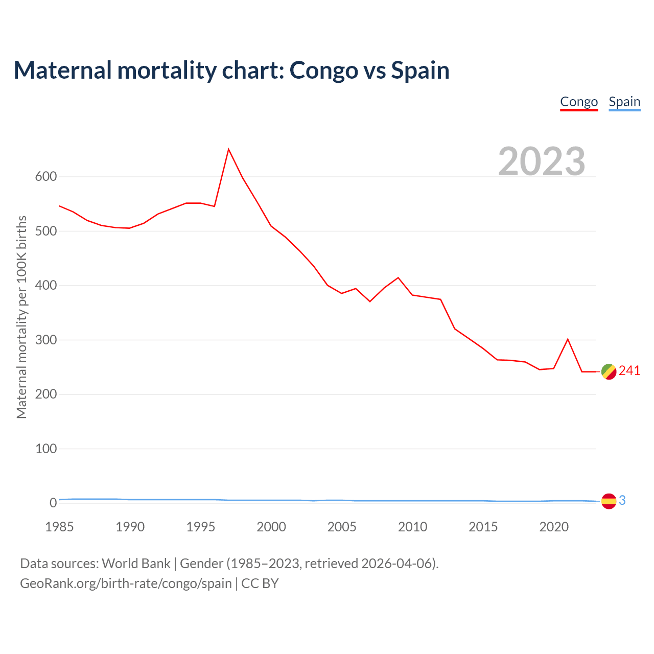 The maternal mortality rate, which is the probability of dying during childbirth or within 42 days of pregnancy termination, is 241 deaths per 100,000 live births in the Congo, compared to 3 deaths in Spain.