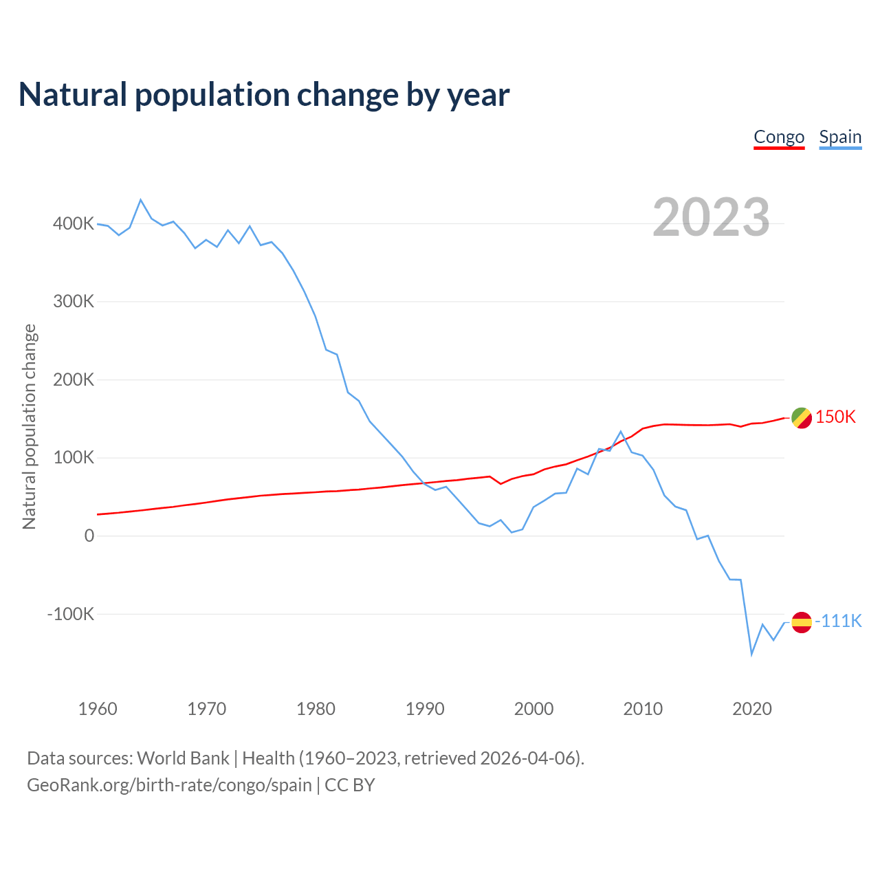 According to the latest available data on birth rates, the fertility rate in the Congo was 4.16 children per woman in 2023, compared to 1.12 in Spain in 2023. The replacement level is considered to be 2.1 children per woman.