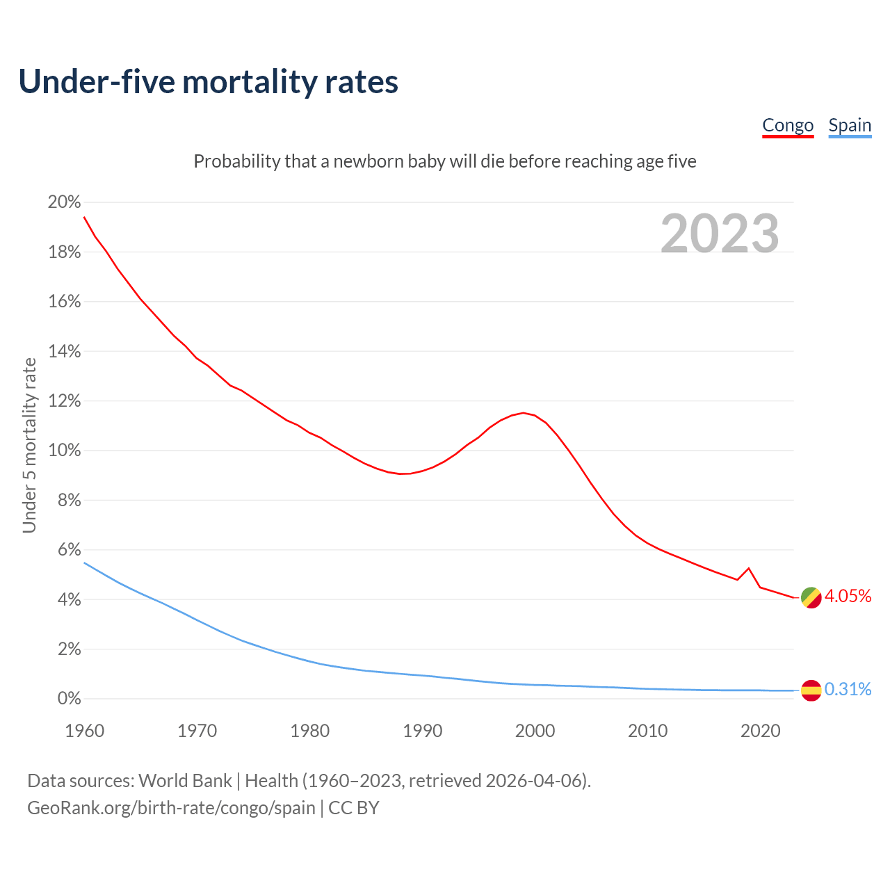 The chance that a newborn baby will die before reaching age five is 4.05% in the Congo and 0.31% in Spain. Above is a chart with historical data on under-five mortality rates.