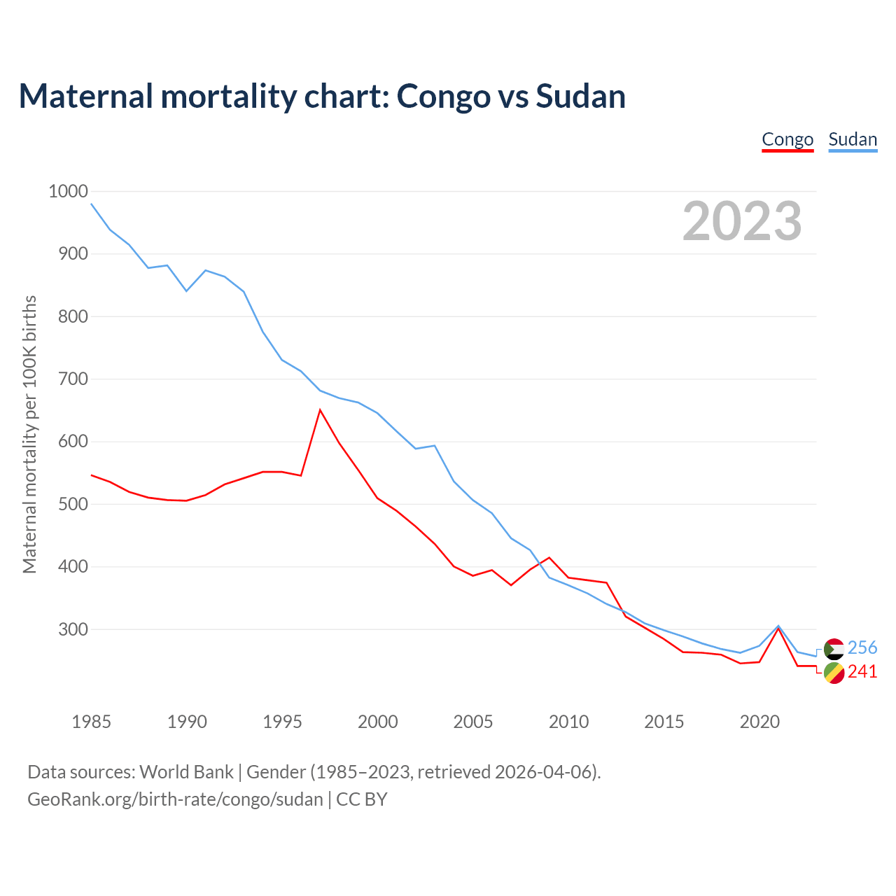 The maternal mortality rate, which is the probability of dying during childbirth or within 42 days of pregnancy termination, is 241 deaths per 100,000 live births in the Congo, compared to 256 deaths in Sudan.